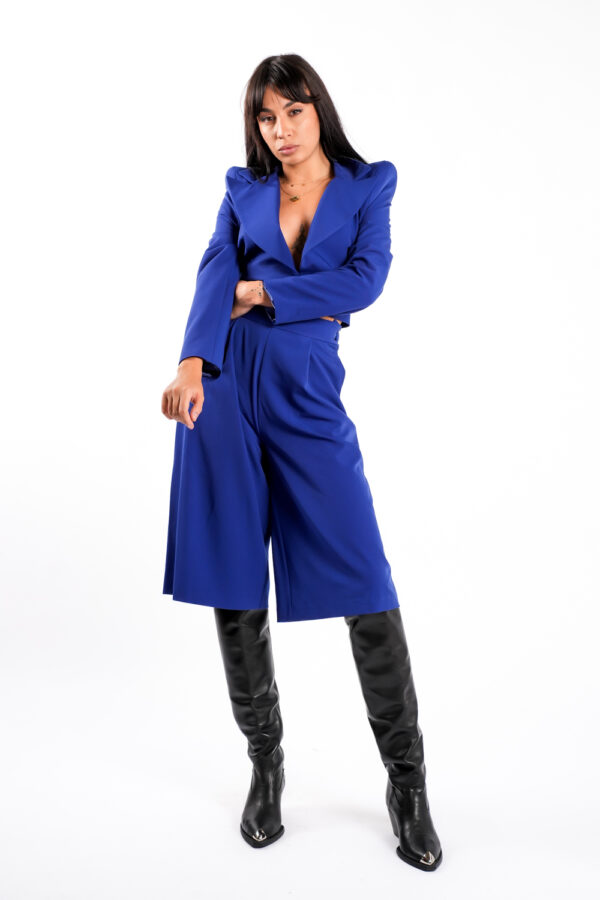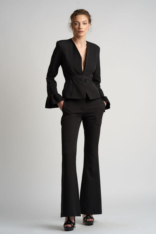 Costum elegant din doua piese cu sacou petrecut si pantaloni evazati