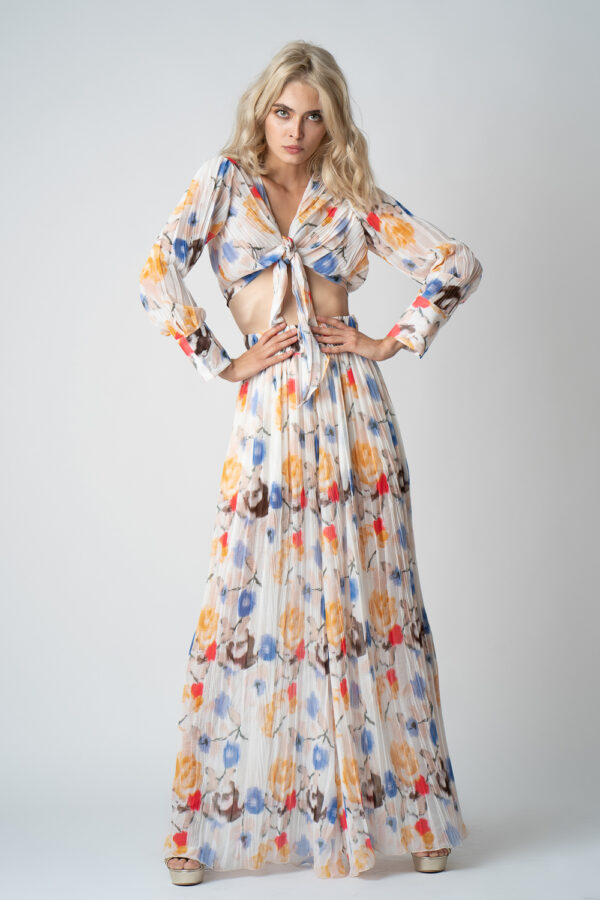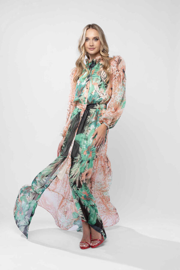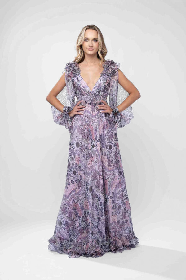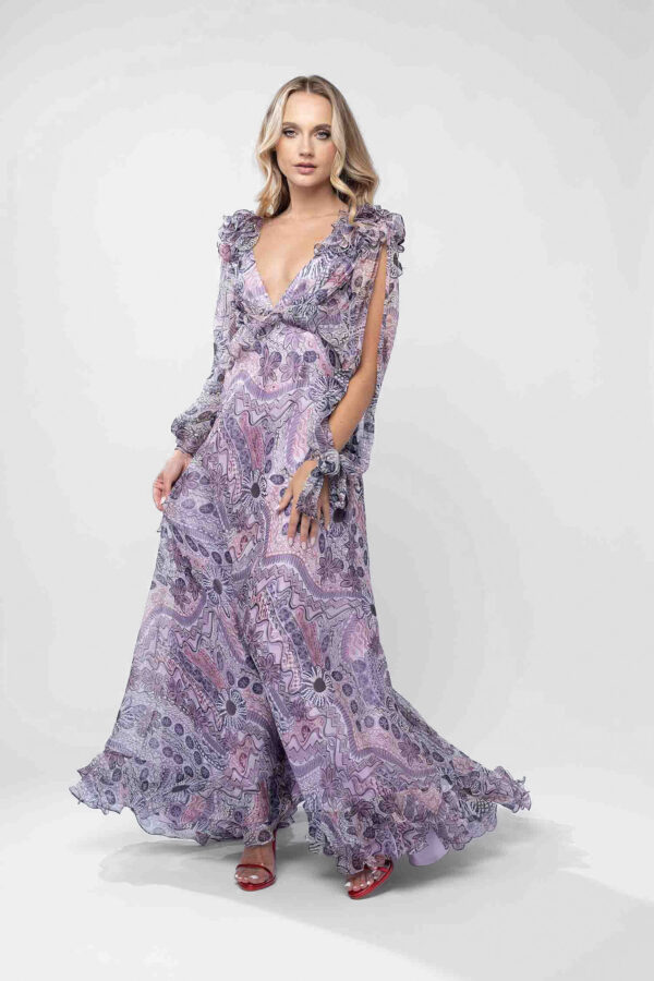 Rochie lunga din voal de matase cu imprimeu si volane dramatice