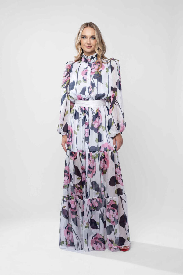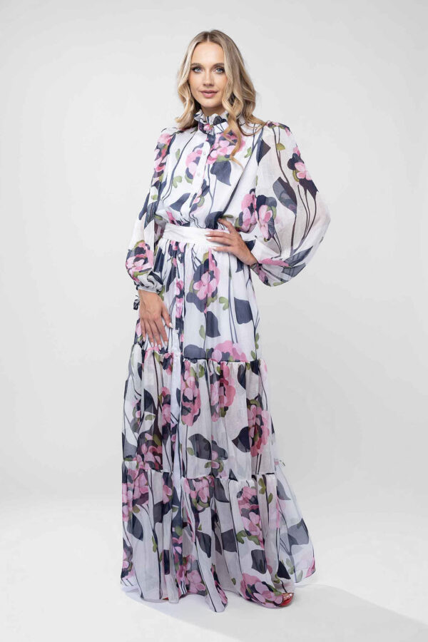 Rochie lunga cu guler inalt si imprimeu floral pictural