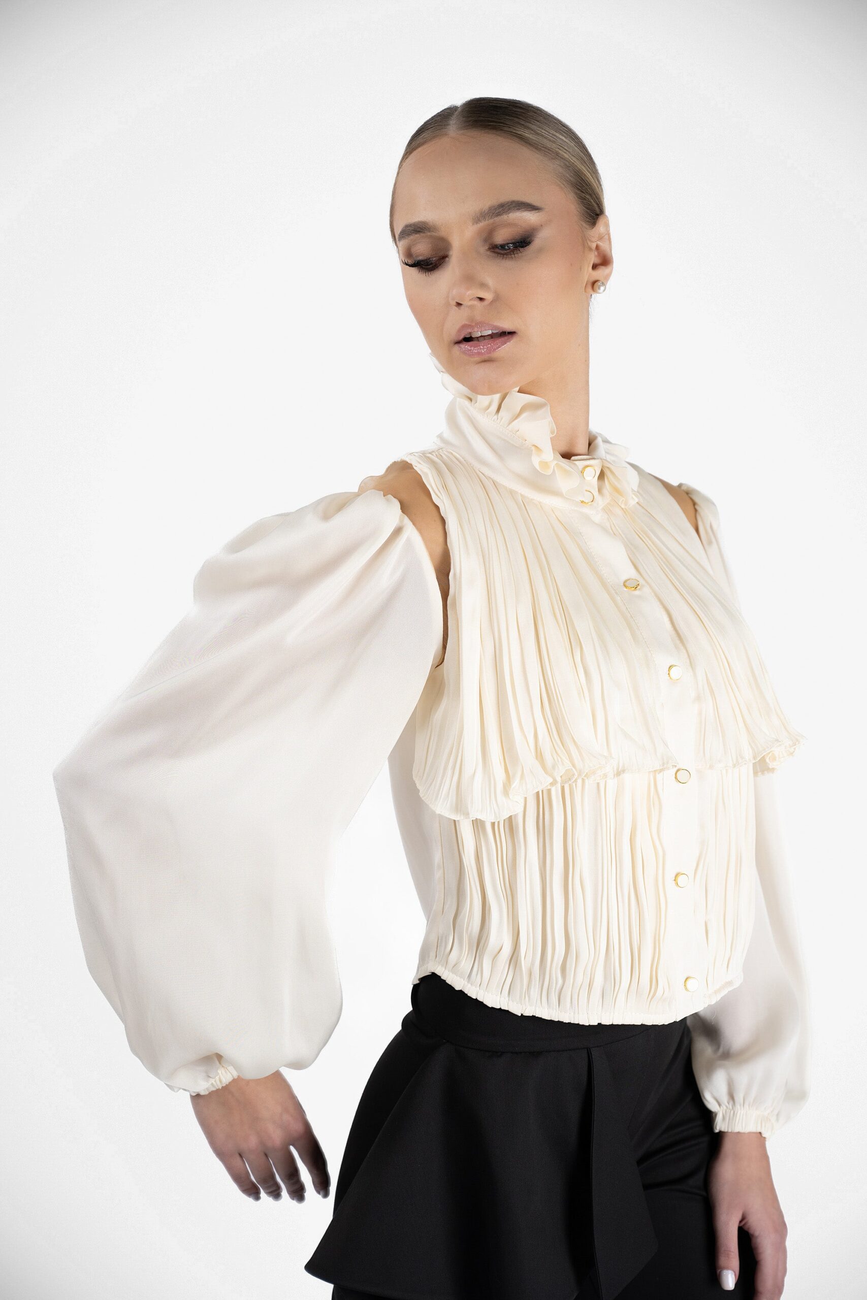 Acest top rafinat este confectionat integral din matase naturala ivoire, cu o textura plisata ce adauga volum si eleganta. Designul delicat este completat de detalii precum gulerul usor inalt, manecile lungi si transparente si decupajele discrete la umeri. Se inchide in fata cu nasturi imbracati, pastrand o linie fluida si feminina.
