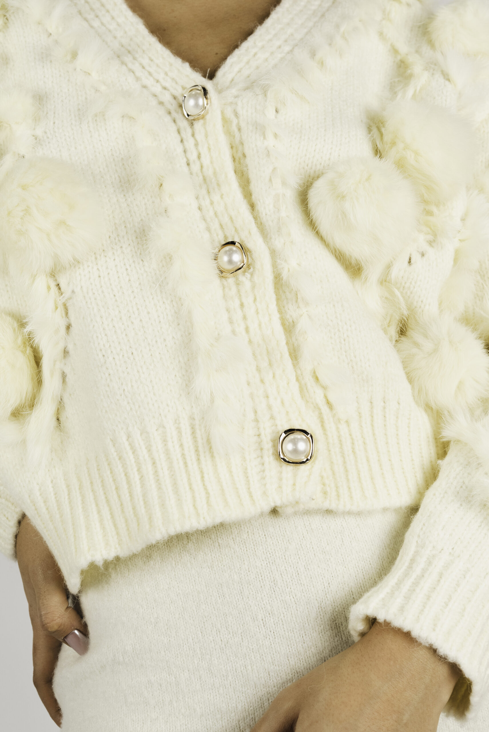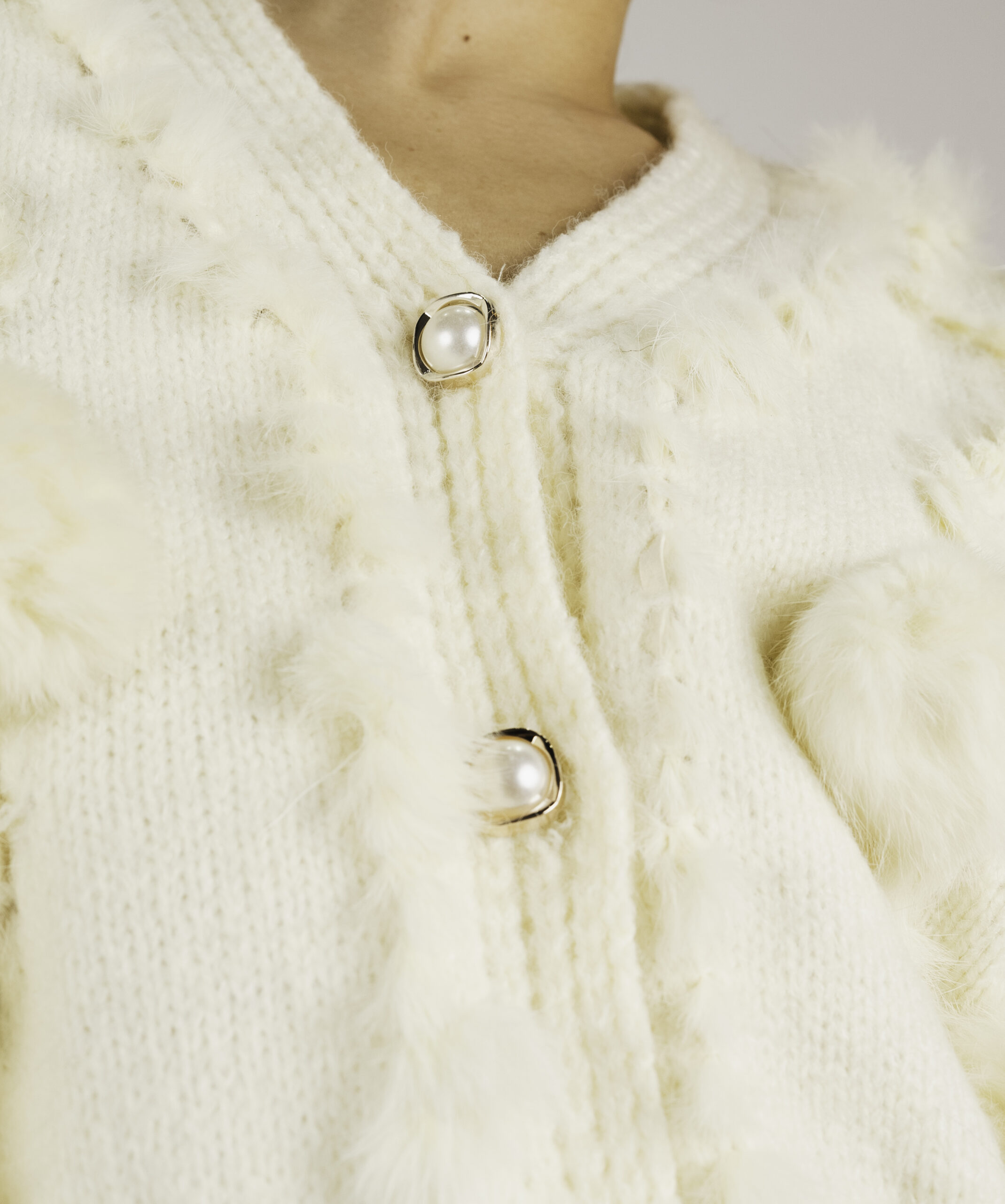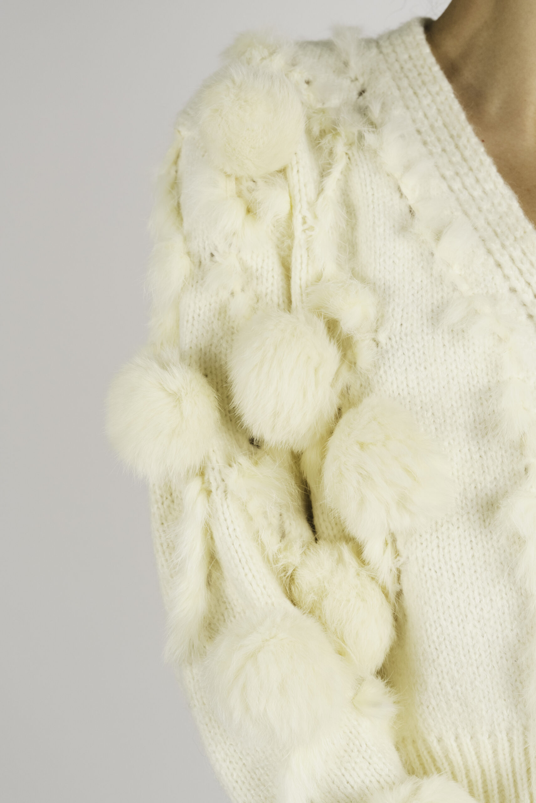 Pulover tricotat din lana cu blana naturala și detalii perlate