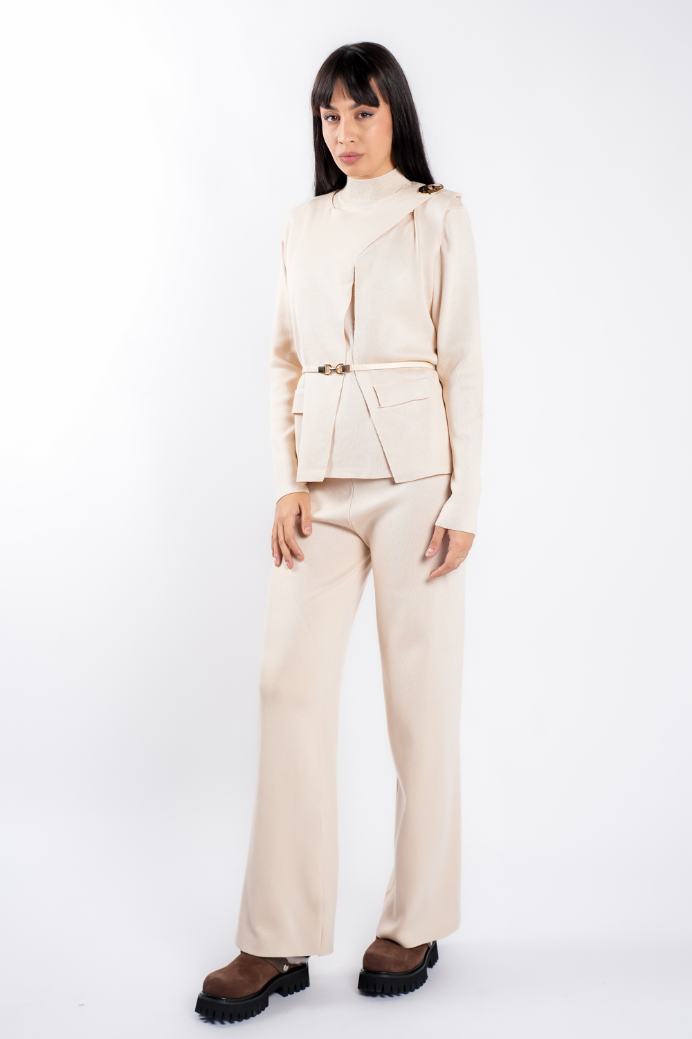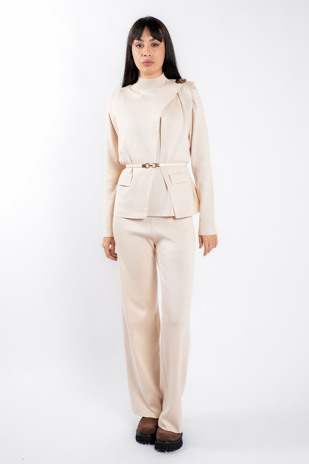 Compleu lejer si modern, compus din helanca moale, vesta cu croiala asimetrica si pantalon drept. Centura subtire cu detaliu metalic adauga un accent discret, pastrand lookul relaxat si echilibrat. O tinuta confortabila, potrivita pentru zile active, birou sau momente casual cu stil.