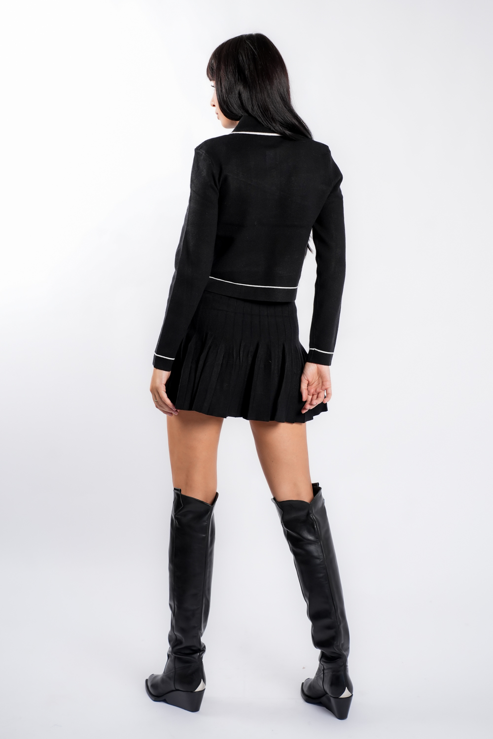 Un compleu elegant si modern, realizat din viscoza fina, ideal pentru zilele in care vrei sa imbini rafinamentul cu confortul. Puloverul scurt, cu guler contrastant si nasturi decorativi, aduce un aer sofisticat si contemporan, completat perfect de fusta mini plisata. Un set versatil, usor de purtat atat in tinute casual chic, cat si in contexte office relaxate.