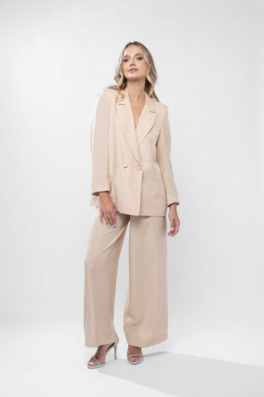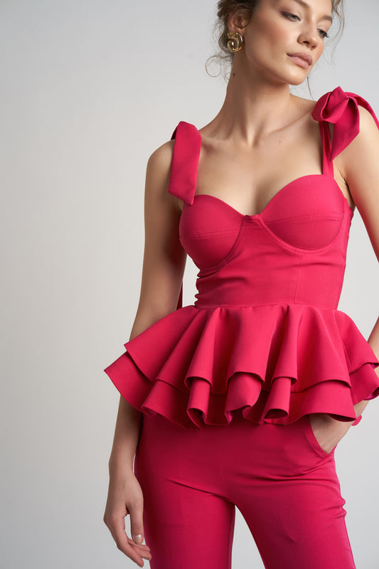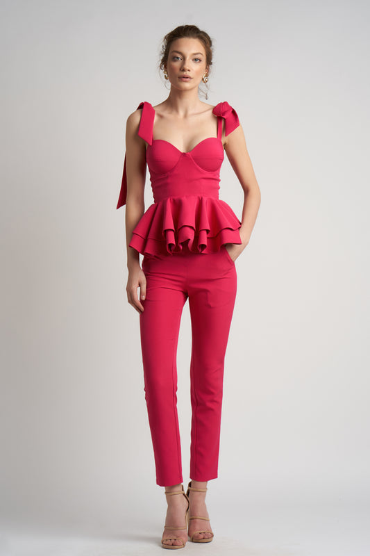 Un compleu spectaculos, in care eleganta clasica intalneste dramatismul modern. Topul bustier cu volane ample si bretele ajustabile, legate in funde delicate, scoate in evidenta linia umerilor si silueta feminina. Pantalonii conici, cu croiala precisa si dungi subtile, echilibreaza armonios volumul topului, oferind un look sofisticat si versatil. Fiecare detaliu este gandit pentru a atrage atentia si a pune in valoare rafinamentul purtatoarei.