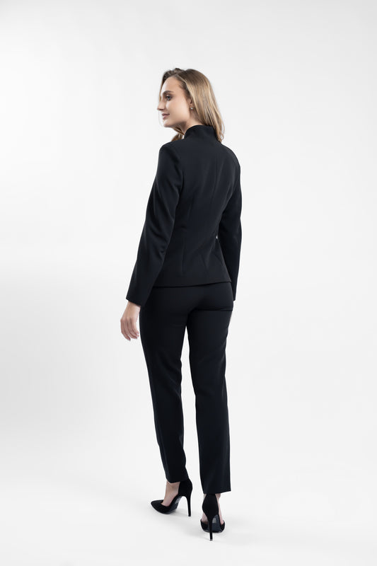 Un ansamblu cu o eleganta pura si un aer impecabil. Acest costum este definit de croiul sau cambrat si gulerul tunica, care adauga rafinament si o nota usor orientala. Nasturii imbracati accentueaza liniile fluide ale sacoului, iar pantalonul conic completeaza look-ul cu o sobrietate sofisticata.