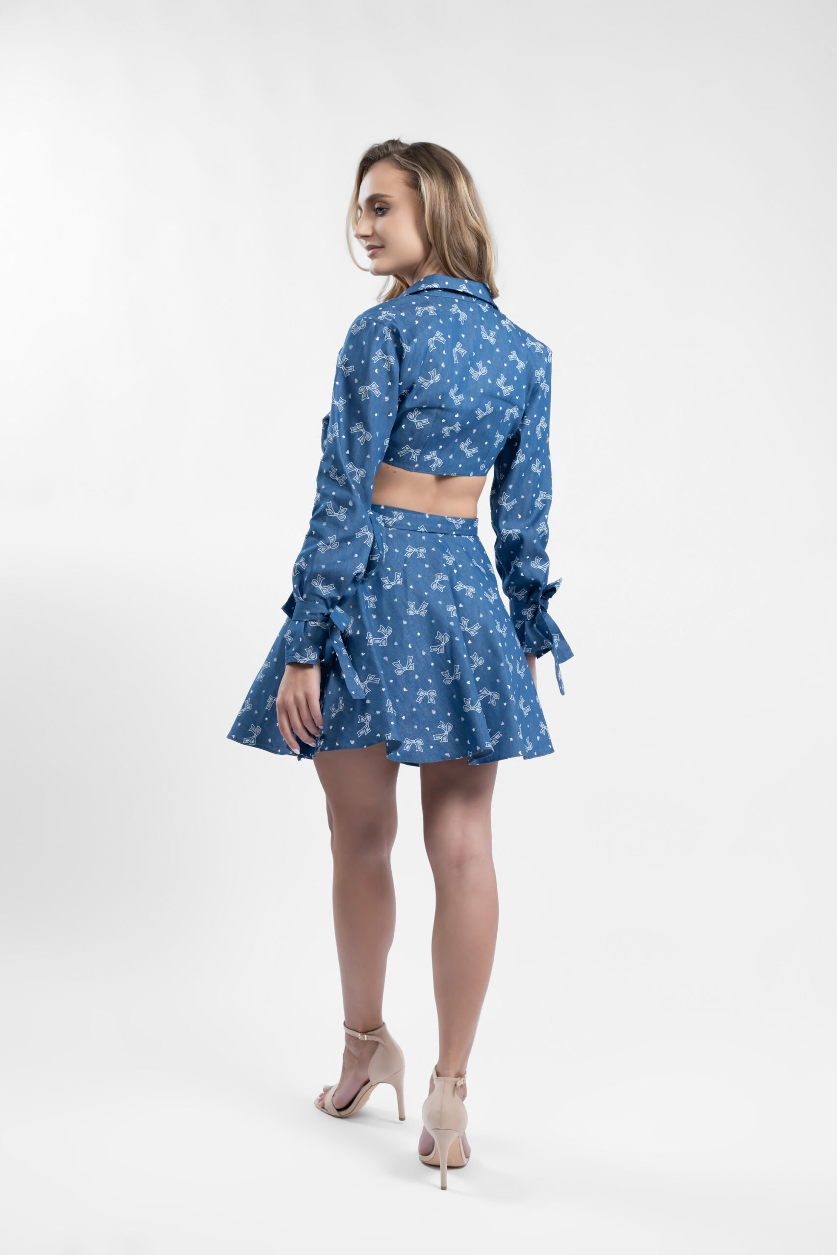 Set format din top cu guler si maneci lungi, cu nod decorativ in fata si decupaj care evidentiaza talia. Fusta scurta, usor evazata, are croiala petrecuta si talie lata care subliniaza silueta. Un look cu aer jucaus si seducator, potrivit pentru evenimente de zi, cocktailuri, petreceri sau vacante urbane.