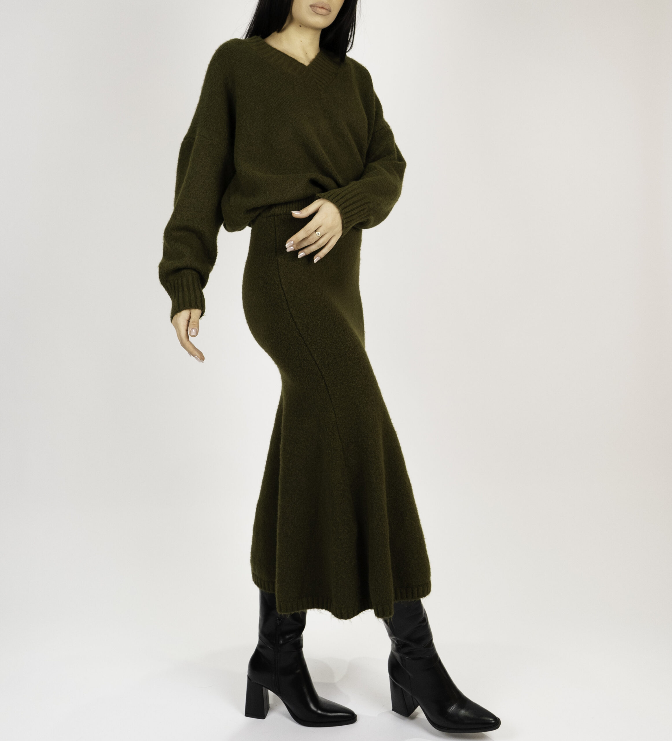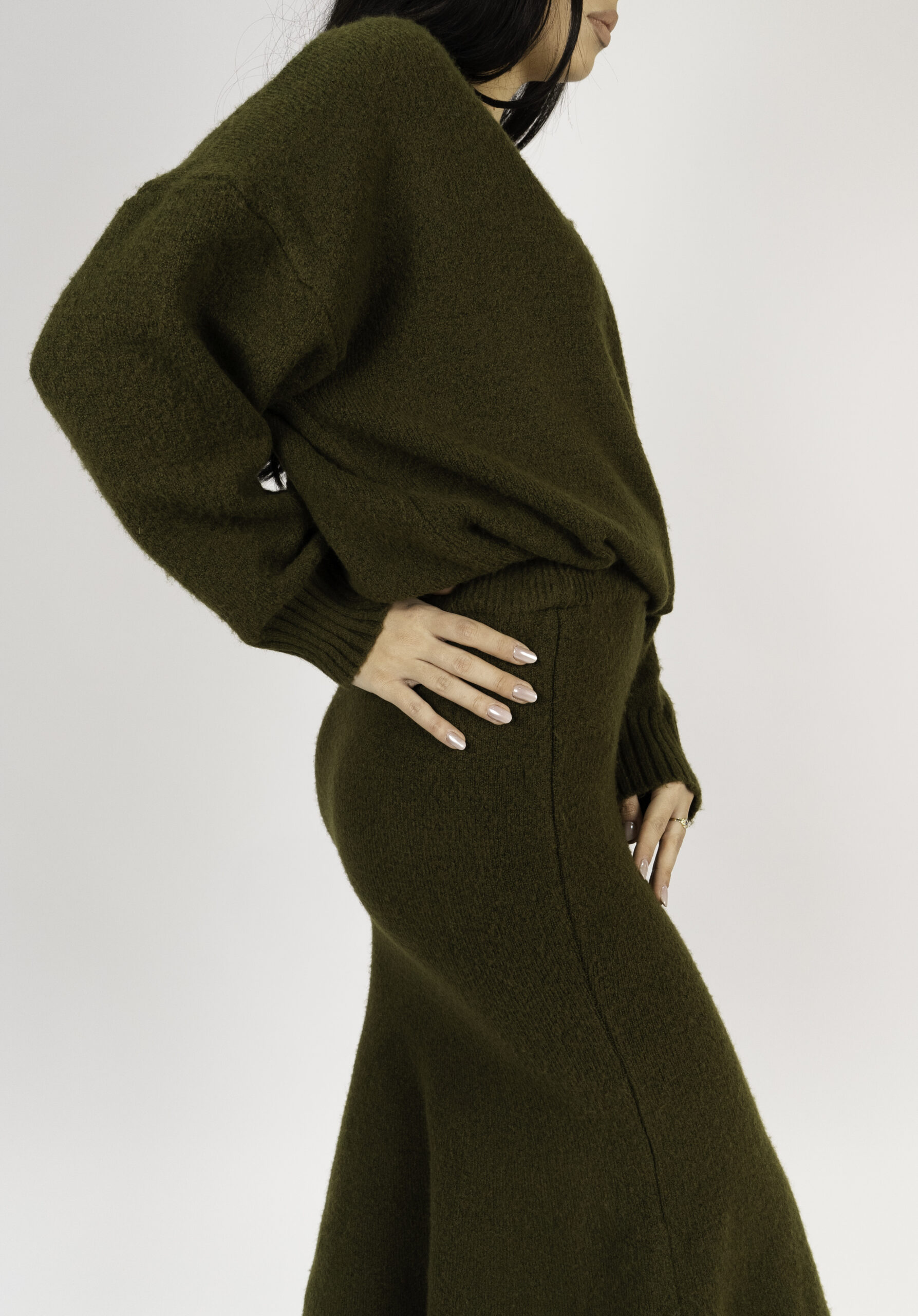 Acest set tricotat din lână, compus dintr-o fustă midi și un pulover oversized, aduce un echilibru perfect între confort și eleganță. Realizat din lână de înaltă calitate, acest set oferă o siluetă sofisticată și un look relaxat, perfect pentru zilele mai răcoroase.