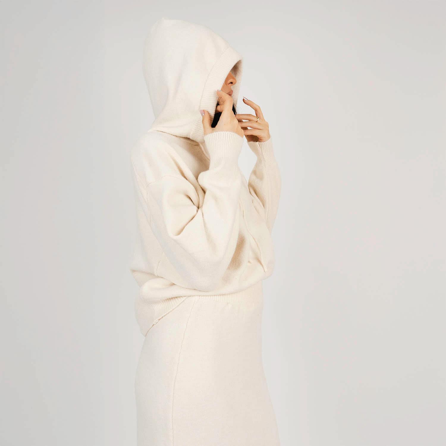 Acest set tricotat din lână, compus dintr-o fustă midi și un hanorac cu glugă, este combinația perfectă între confort și stil. Realizat din lână de înaltă calitate, acest set este ideal pentru zilele mai răcoroase, oferind atât căldură, cât și un look modern. Fusta midi îți subliniază silueta, în timp ce hanoracul oversized completează ținuta cu un aer relaxat și chic. Nuanța ivory adaugă un plus de eleganță și versatilitate, perfectă pentru un stil casual sofisticat.