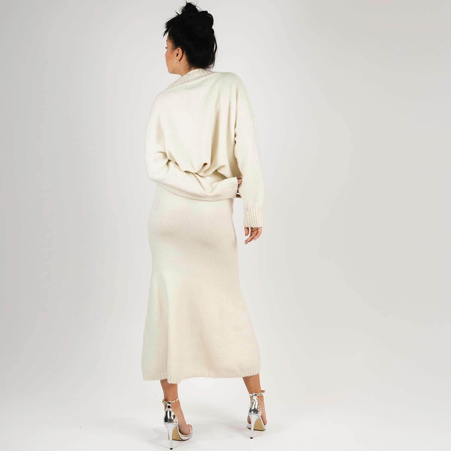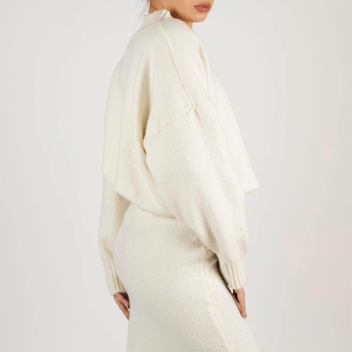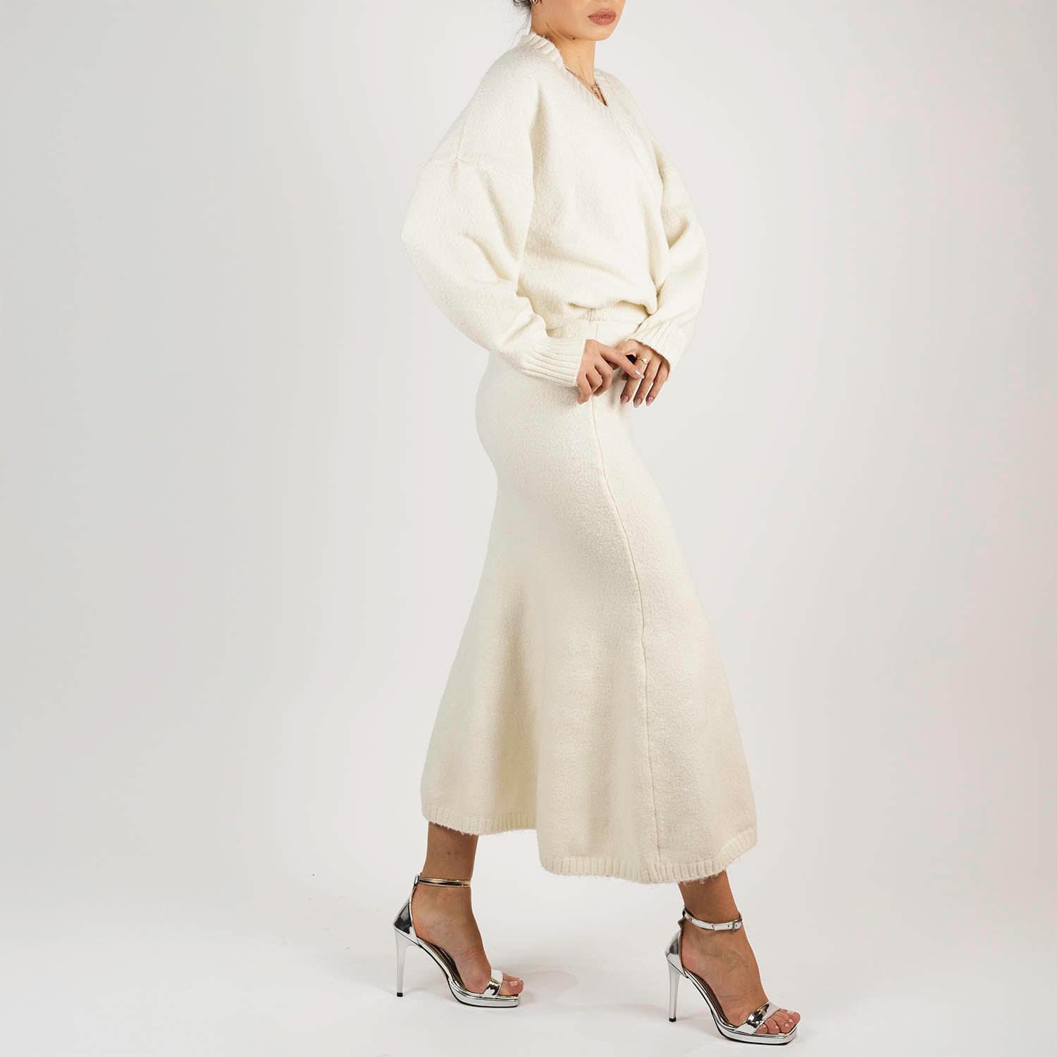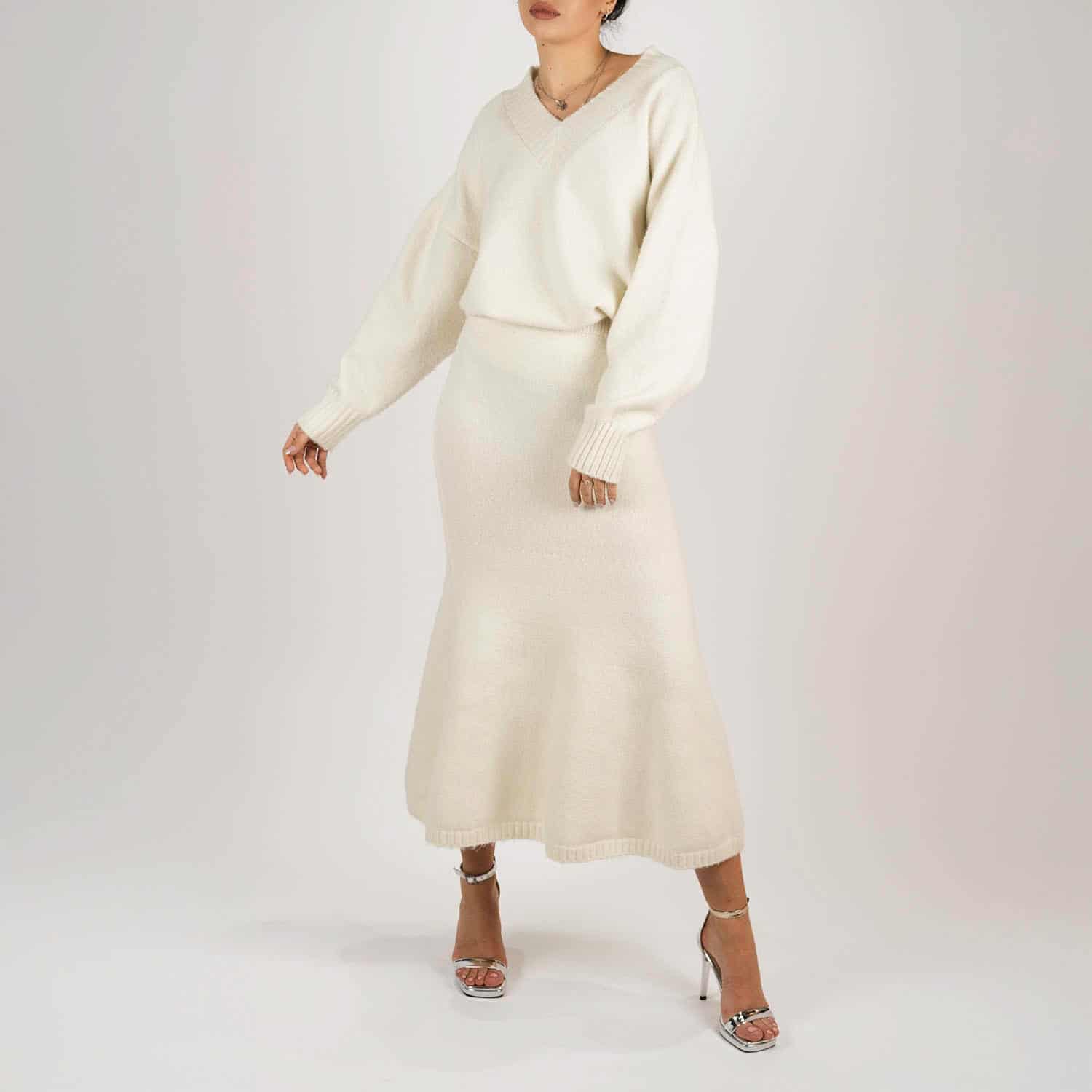 Acest set tricotat din lână, compus dintr-o fustă midi și un pulover oversized, aduce un echilibru perfect între confort și eleganță. Realizat din lână de înaltă calitate, acest set oferă o siluetă sofisticată și un look relaxat, perfect pentru zilele mai răcoroase. Nuanța ivory adaugă un plus de rafinament și versatilitate, fiind ideal pentru un stil casual elegant sau pentru momentele în care dorești să te simți confortabil, dar în tendințe.