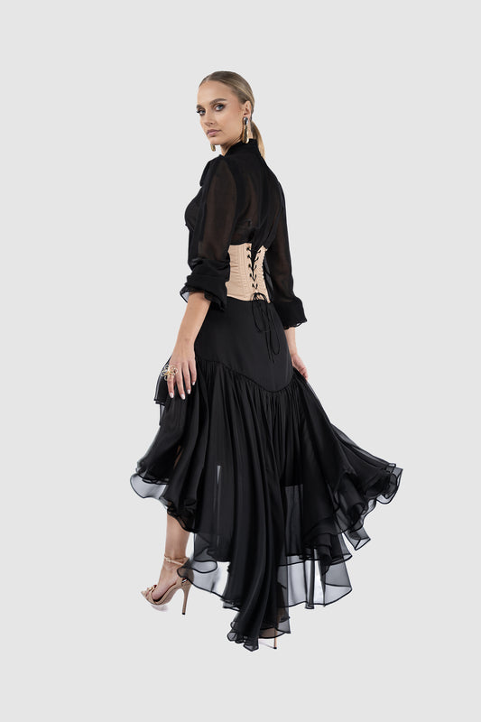 Feminina si spectaculoasa, aceasta fusta lunga din matase cu croiala asimetrica impresioneaza prin fluiditatea materialului si dinamica volanelor ample. Designul amplu accentueaza miscarile, conferind un efect dramatic si elegant, iar talia bine definita subliniaza silueta intr-un mod subtil si sofisticat.
