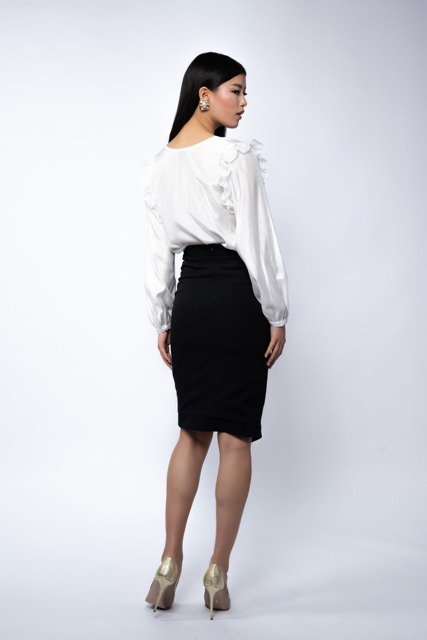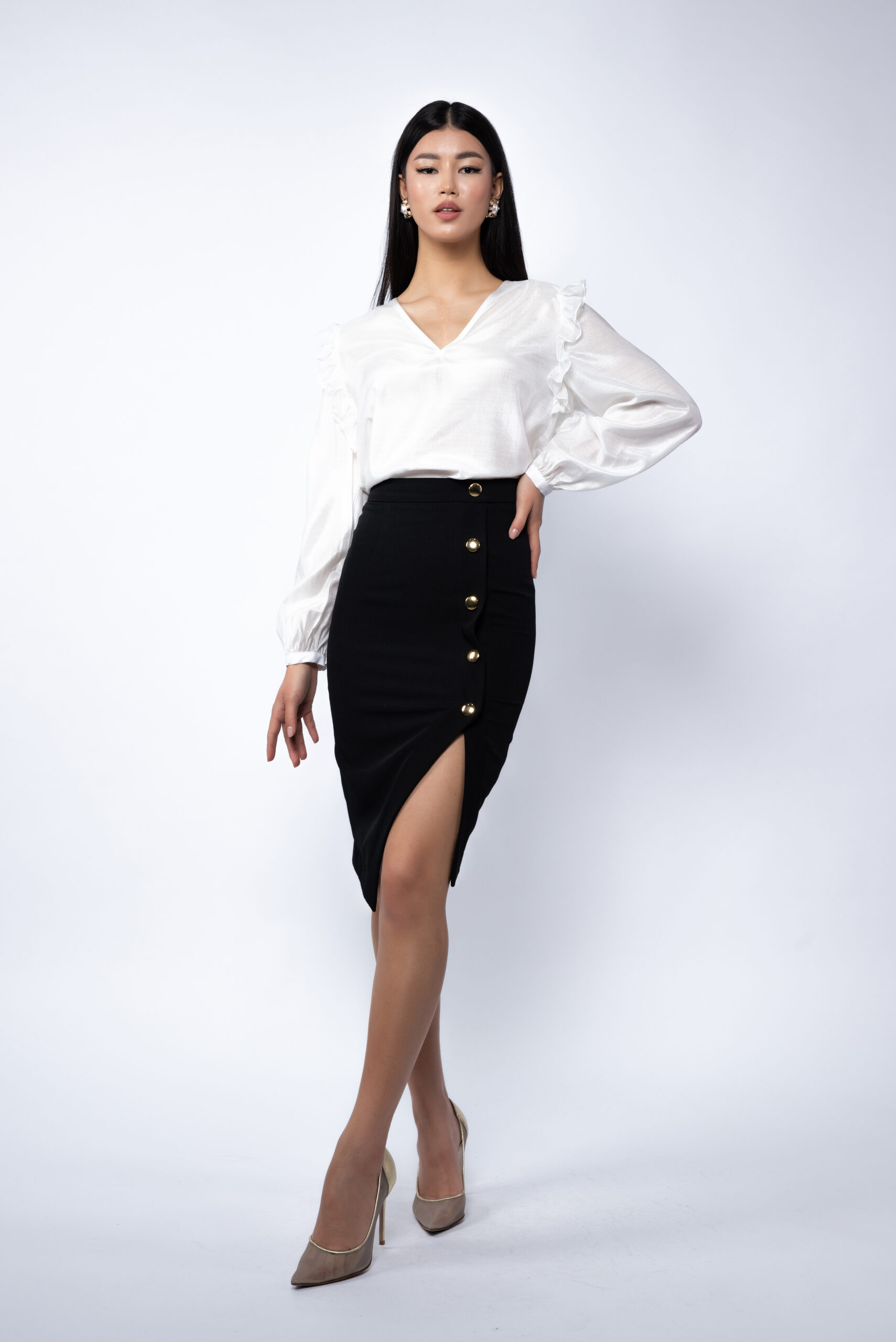 Fusta conica, cu talie inalta si slit frontal, accentuata de nasturii decorativi aurii ce adauga un touch sofisticat. Designul subliniaza silueta si evidentiaza feminitatea, oferind un echilibru perfect intre clasic si modern. Ideala pentru birou, cina in oras sau evenimente semi-formale.
