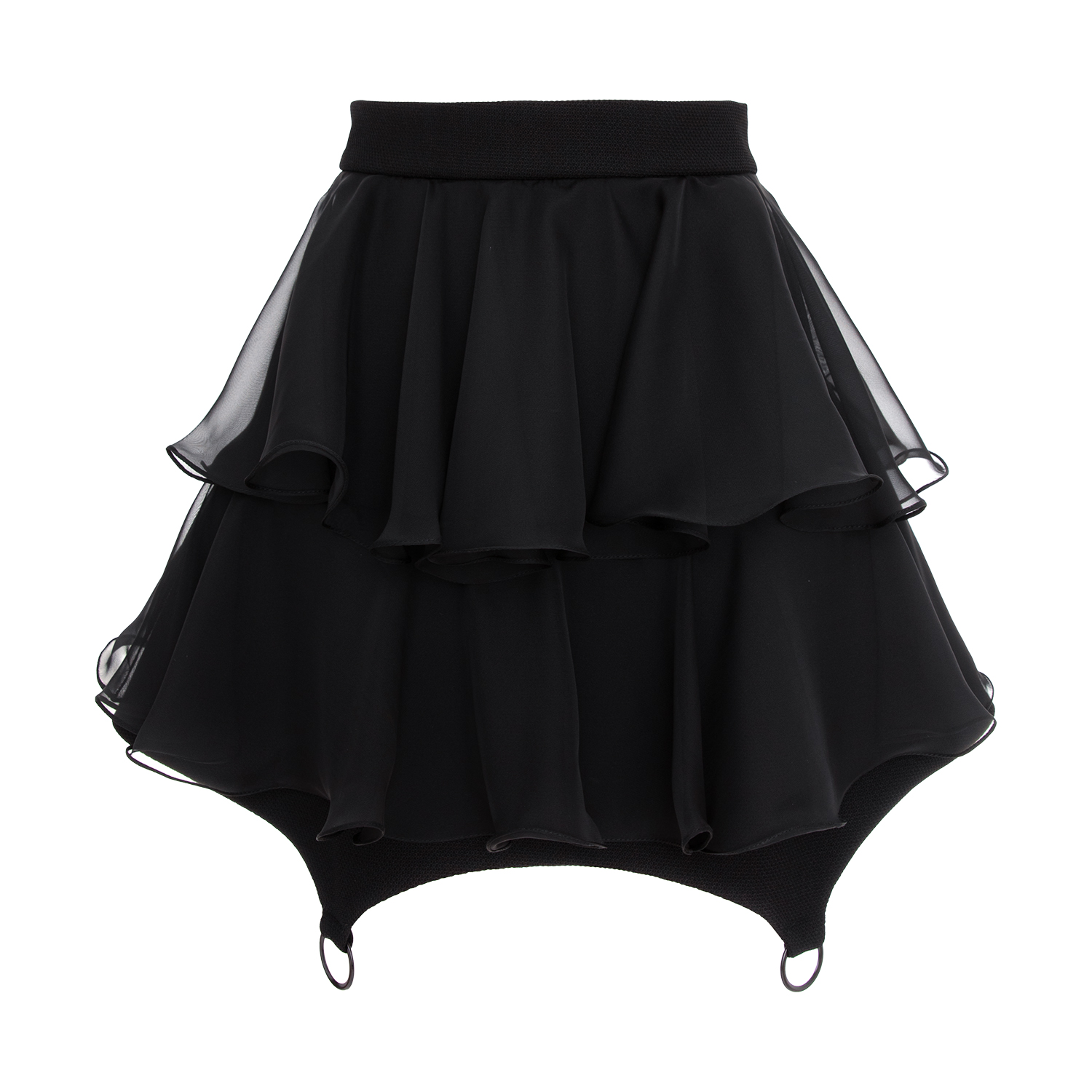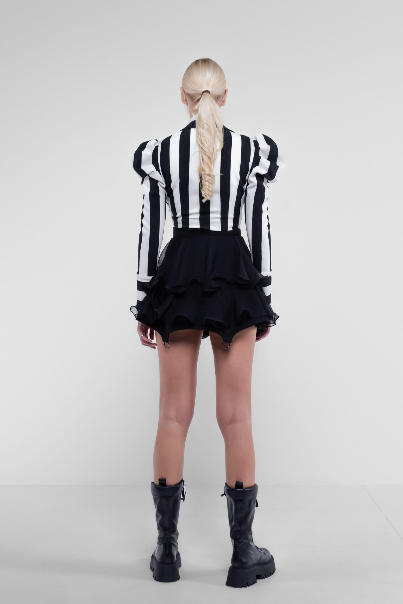 Feminina, provocatoare si plina de atitudine, aceasta fusta mini transforma orice aparitie intr-o declaratie de stil. Realizata din matase fina si vaporoasa, cu volane dispuse in straturi si accente metalice discrete, piesa imbina romantismul cu o nota edgy. Designul sau este gandit pentru a crea miscare si lejeritate la fiecare pas, oferind un efect vizual spectaculos si rafinat.