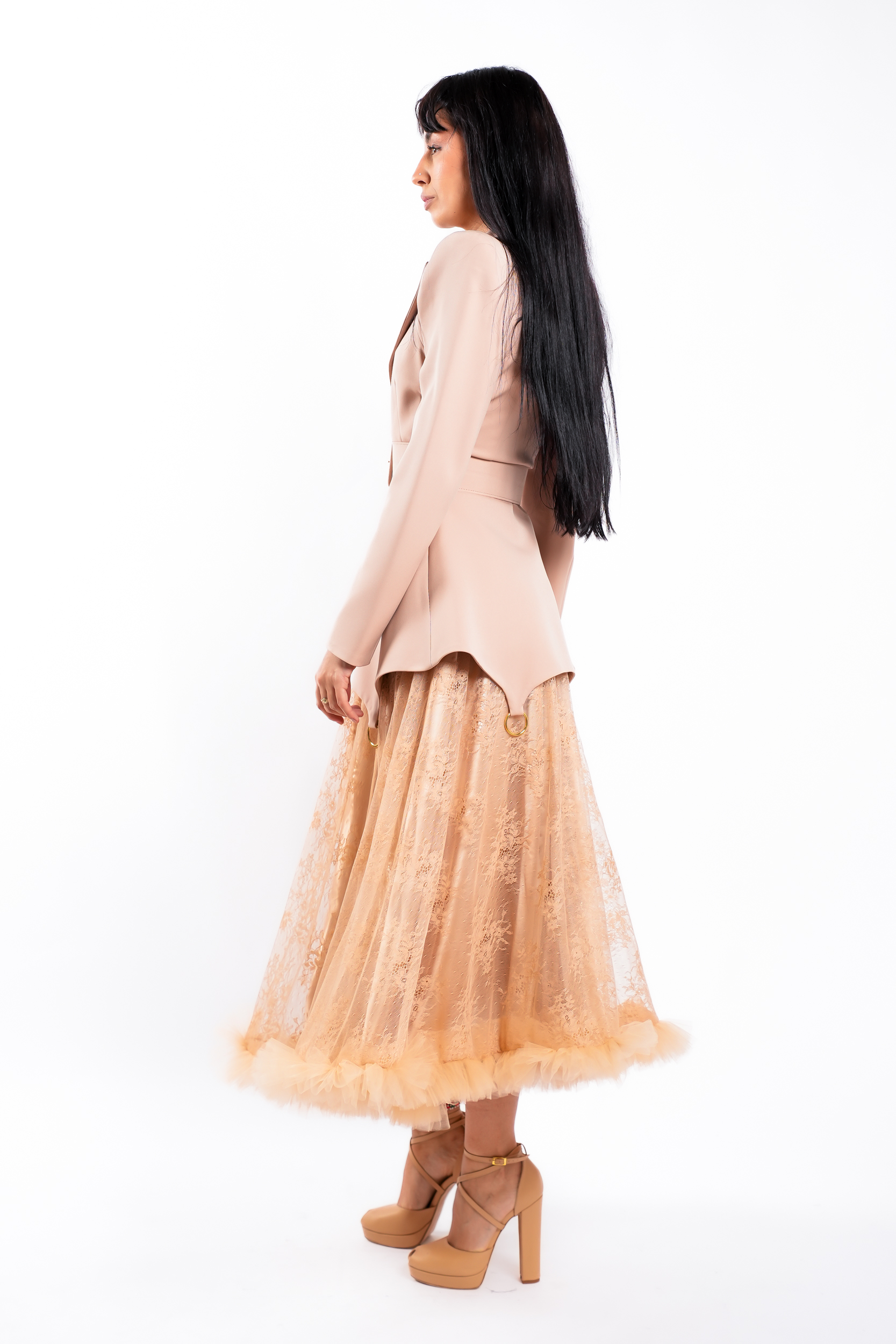 O reinterpretare rafinata a feminitatii moderne, aceasta fusta midi din dantela couture cucereste prin eleganta senzuala si detalii deosebite. Textura pretioasa este pusa in valoare de un volan amplu din tull fin, ce creeaza un joc de volume spectaculos. Piesa este completata de o captuseala detasabila, disponibila in doua variante — scurta, pentru un look indraznet, si lunga, pentru o abordare sofisticata. Un statement de stil, cu atitudine si personalitate.