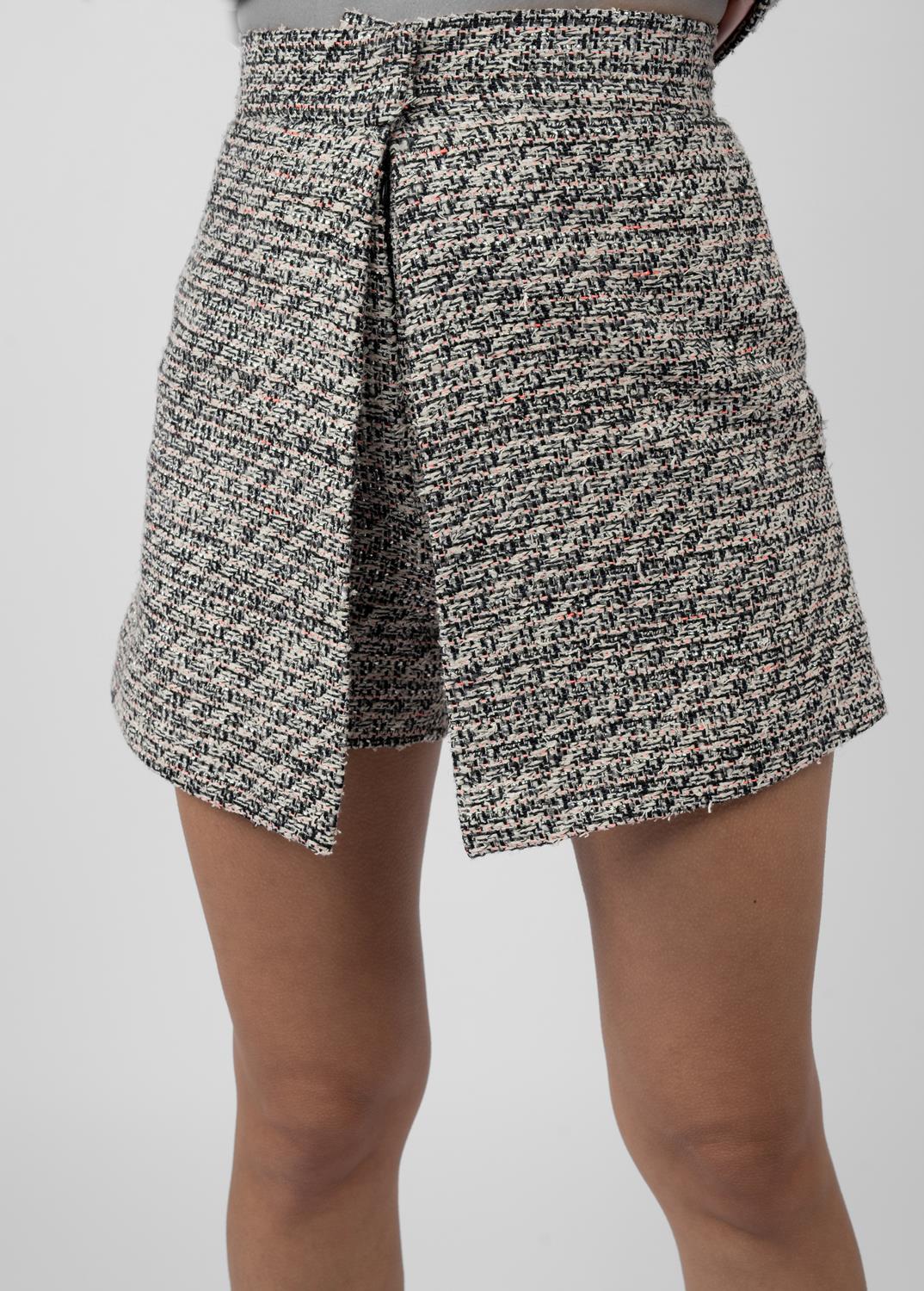 Pantaloni scurti realizati din tweed texturat, cu constructie petrecuta ce creeaza efectul unei fuste mini. Talia inalta evidentiaza silueta, iar textura rafinata aduce un aer sofisticat si modern. Modelul imbina confortul pantalonilor cu eleganta unei fuste clasice.