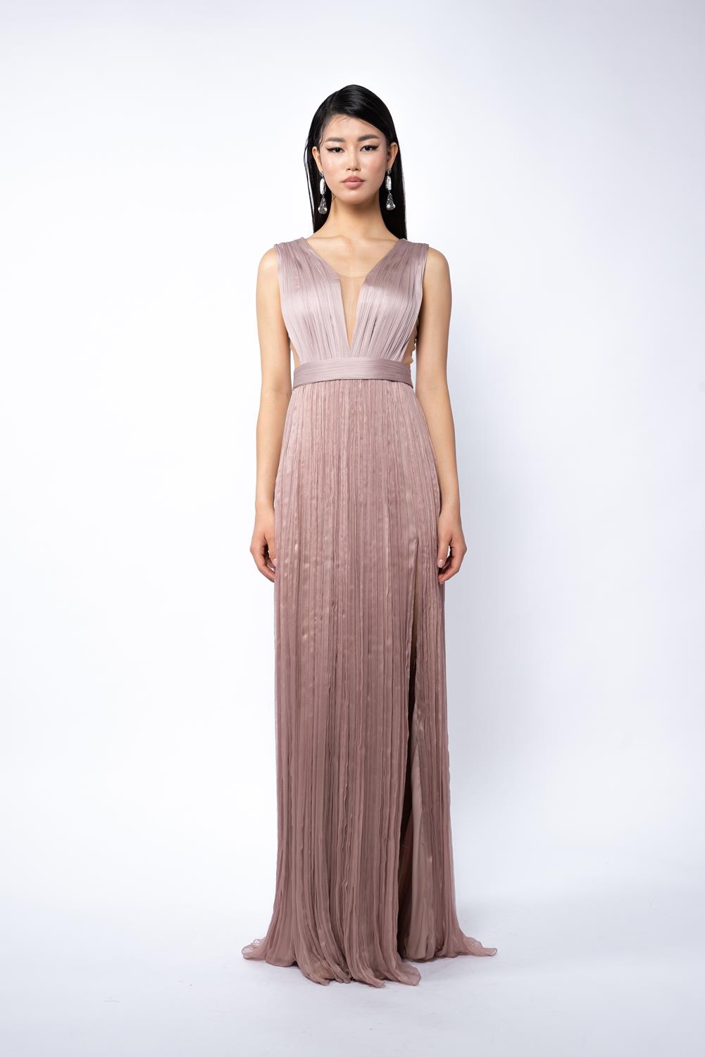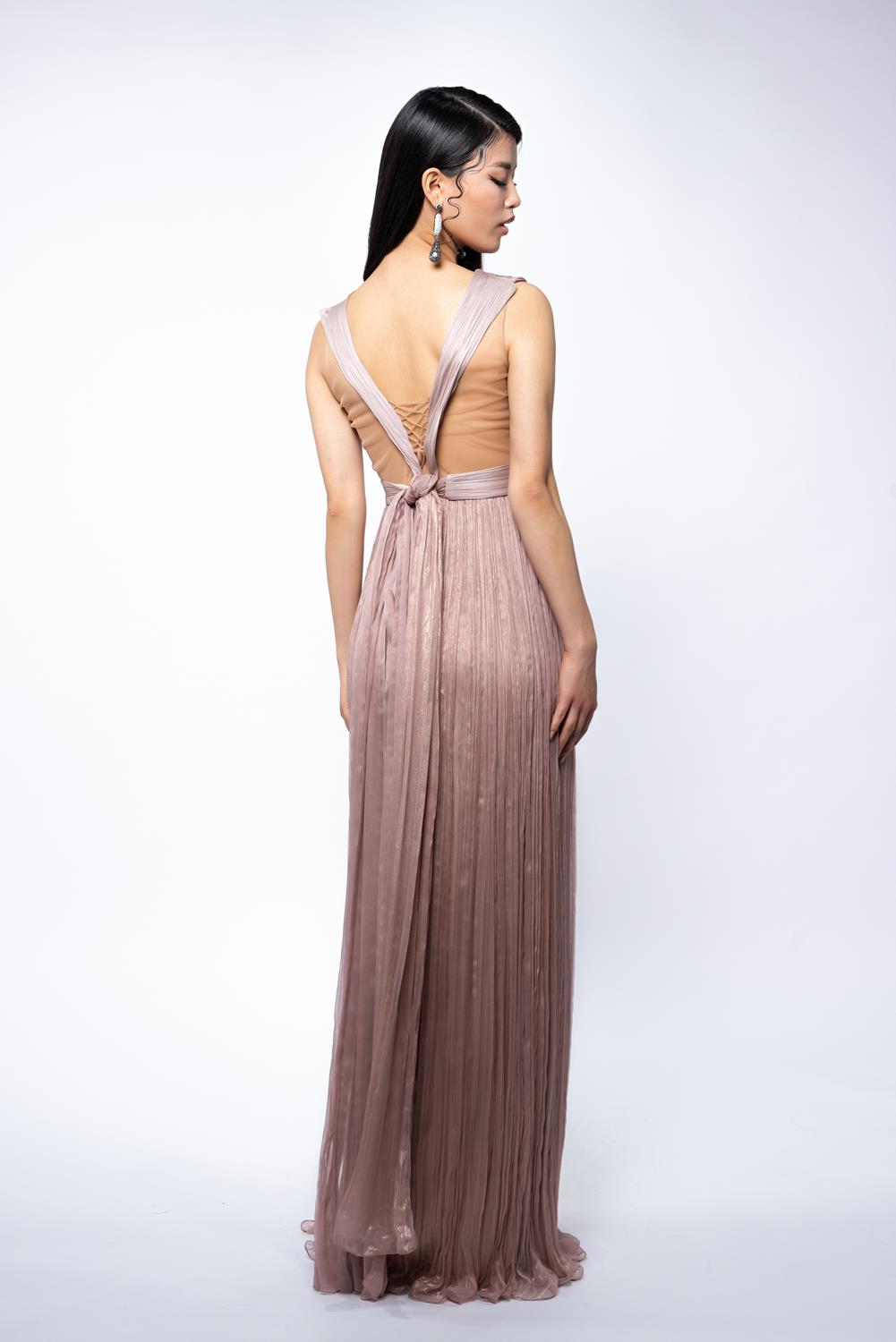 Confectionata din matase cu textura fluida, rochia imbina un slit frontal adanc cu un corset transparent in partea din spate. Bretelele in V si sistemul de inchidere cu siret si fermoar invizibil definesc o silueta precisa, cu detalii subtile si feminine.