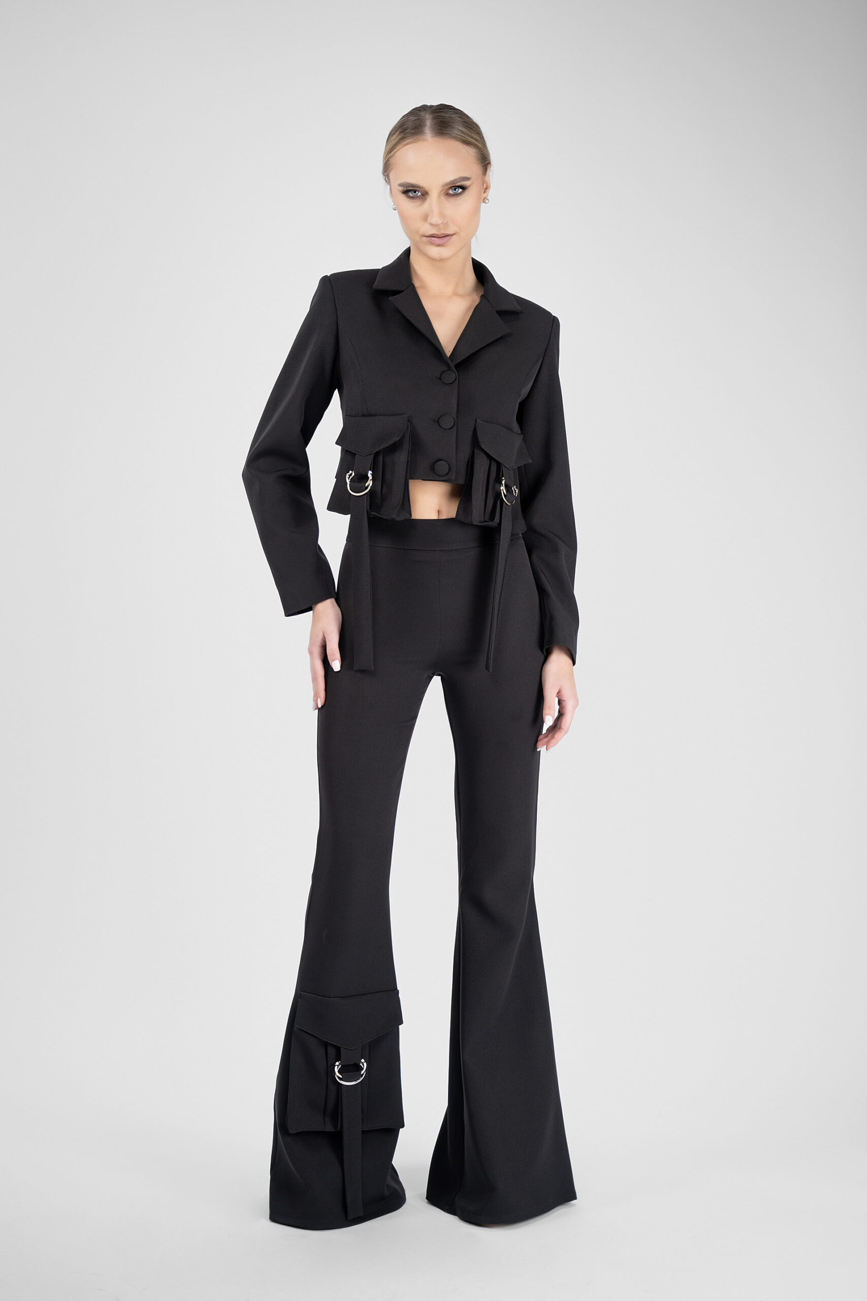 Pantaloni cu croiala evazata si talie inalta, accesorizati cu buzunar aplicat mare si detalii metalice. Designul sculptural al buzunarului si lungimea peste glezna contureaza o aparitie avangardista si curajoasa.