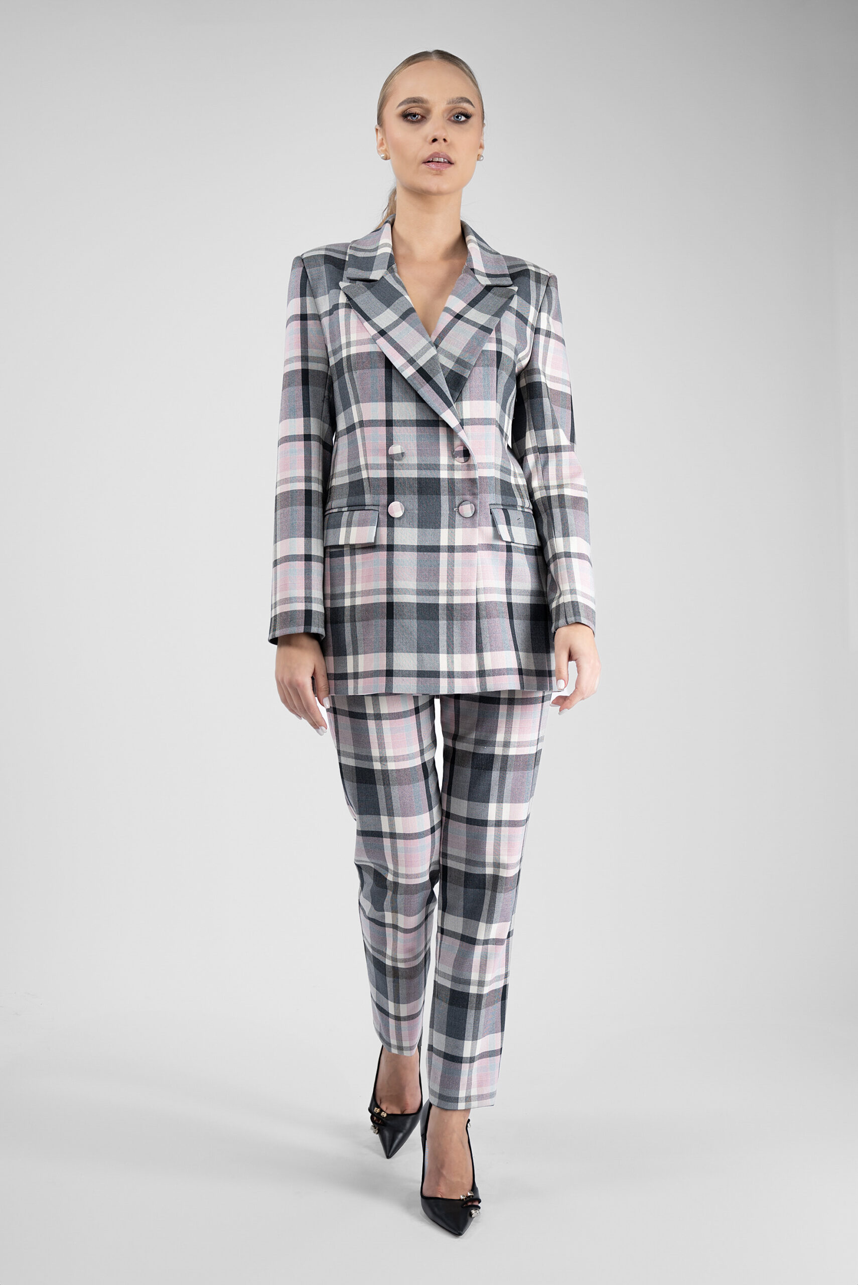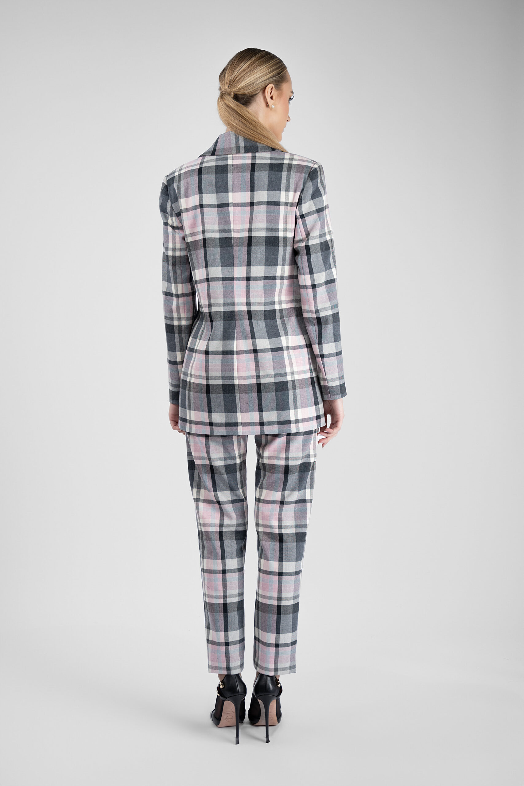Pantalon conic cu talie medie si linie curata, accentuat de un imprimeu in carouri pastel care aduce un aer sofisticat si actual. Designul cambrat pe picior si croiala clasica il transforma intr-o piesa versatila, ideala atat pentru tinute business, cat si pentru stylinguri urbane.