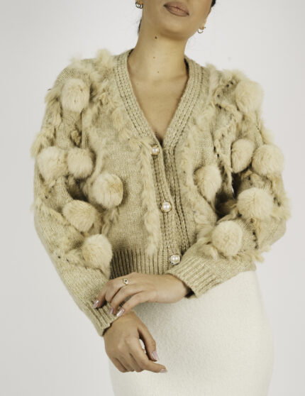 Pulover tricotat din lana cu blana naturala și detalii perlate