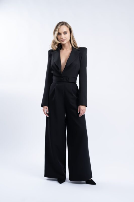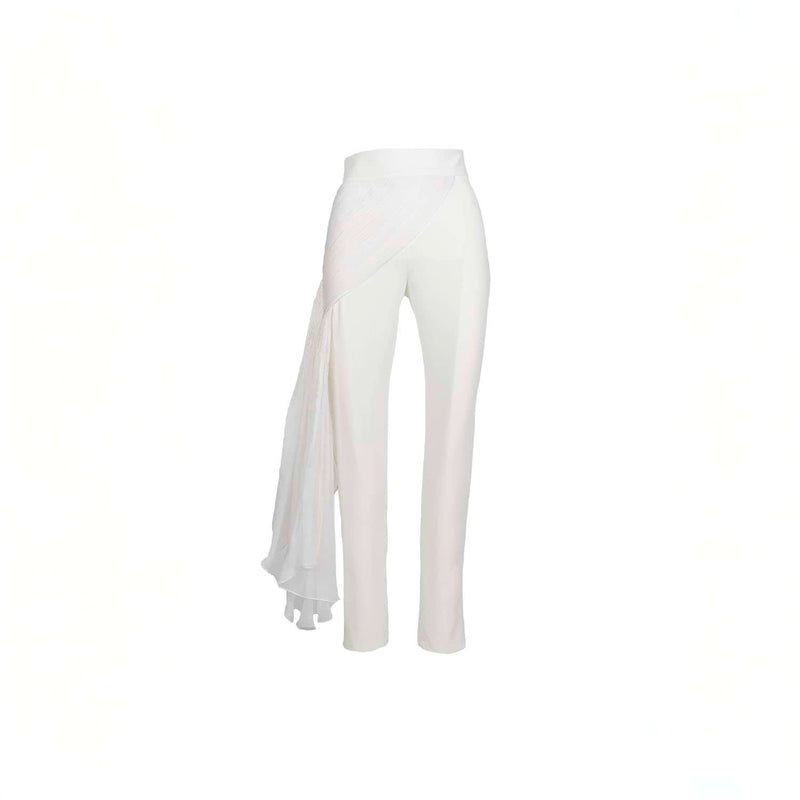 Cu un design care îmbină rigurozitatea croielii clasice cu un detaliu surprinzător, acești pantaloni conici transforma instant orice tinuta. Fronseul frontal adaugă volum și eleganță, iar volanul lateral din voal amplifică dinamismul și feminitatea piesei. Confecționați din crep italian mat, oferă un echilibru perfect între rafinament și îndrăzneală.