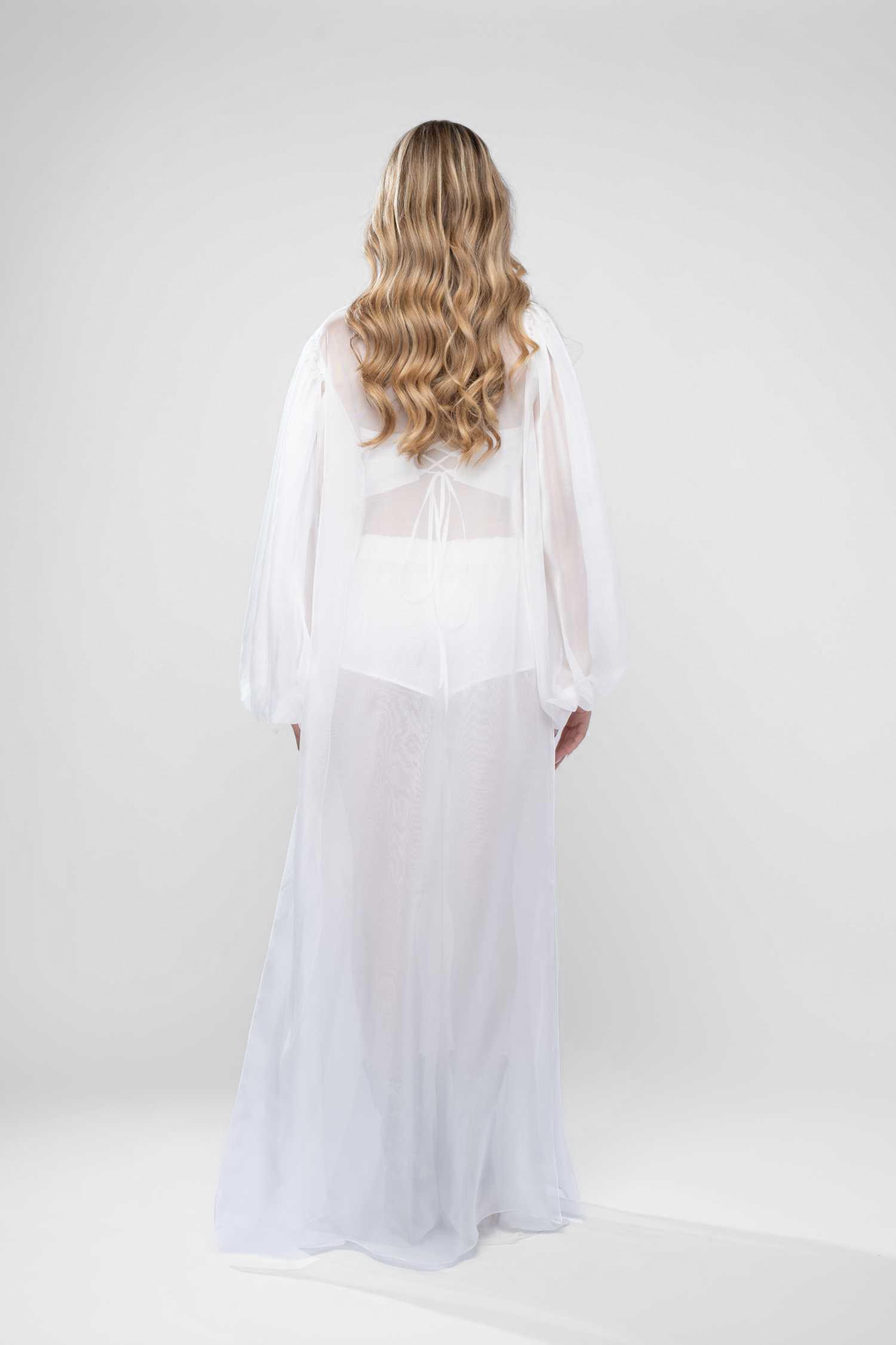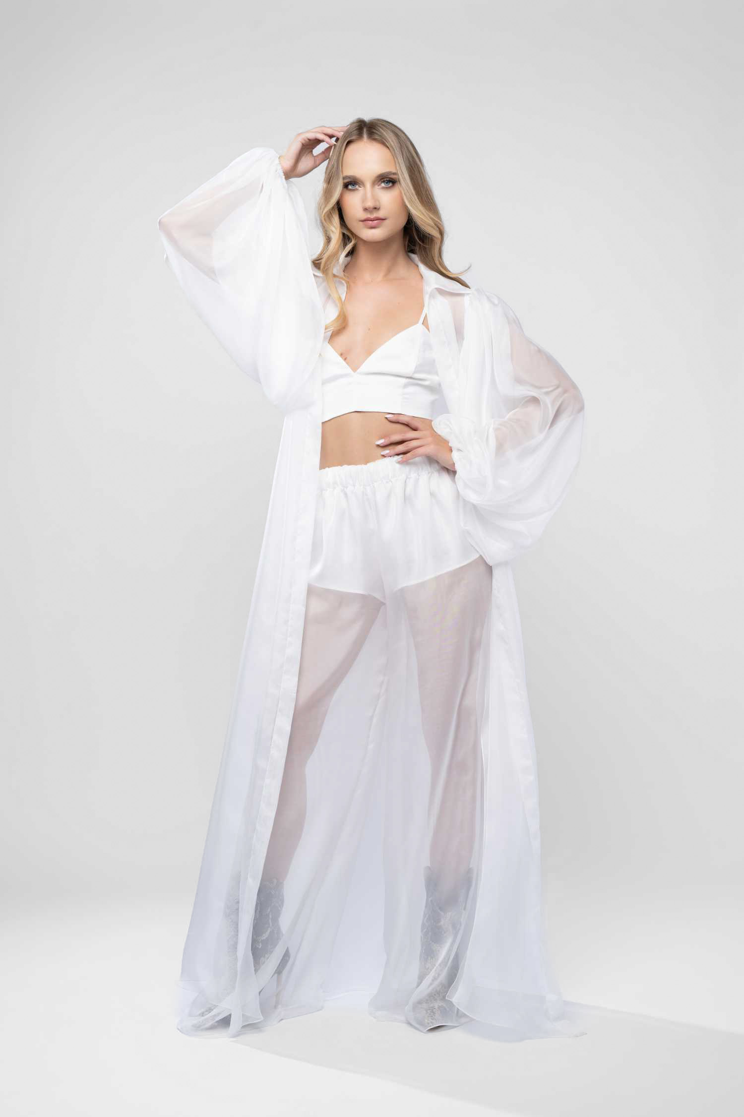 Pantaloni lungi realizati din voal fin, croi amplu si talie elastica confortabila. Modelul are captuseala scurta din satin, creand un efect elegant de transluciditate. Ideali pentru tinute statement de vara sau plaja, oferind o aparitie sofisticata si lejera.