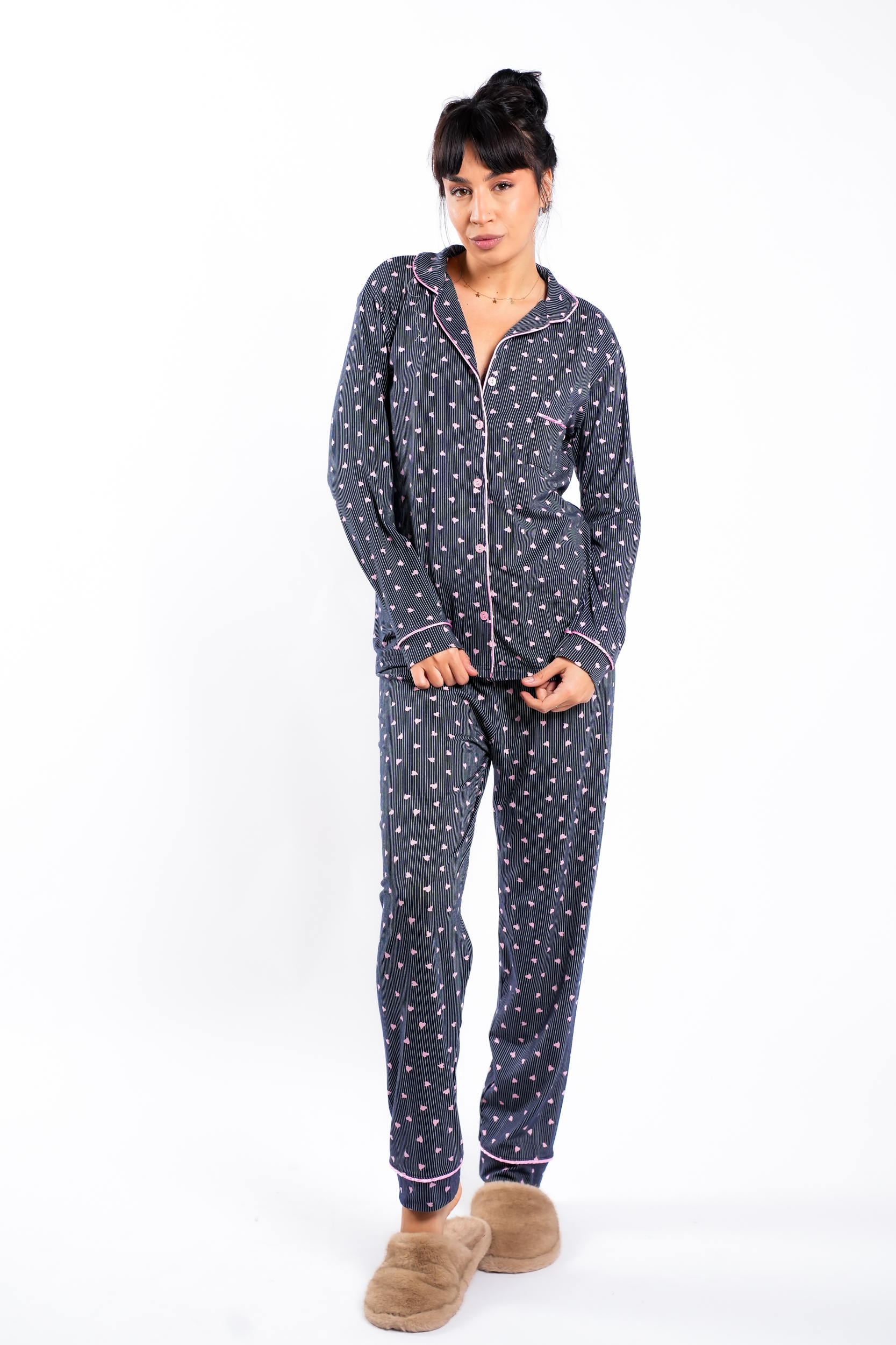 Pijama navy hearts aduce un mix cald si jucaus intre confort si estetica moderna, cu un imprimeu discret de inimioare si linii fine care contureaza o aparitie relaxata, dar atent stilizata. Camasa cu nasturi si piping contrastat ofera un finish ingrijit, iar pantalonul drept completeaza setul cu o potrivire lejera si confortabila.