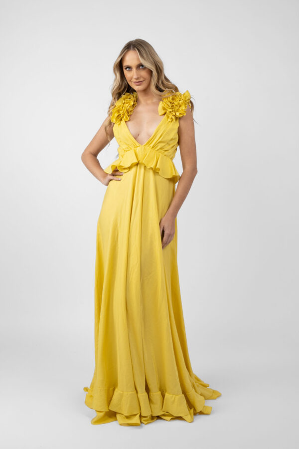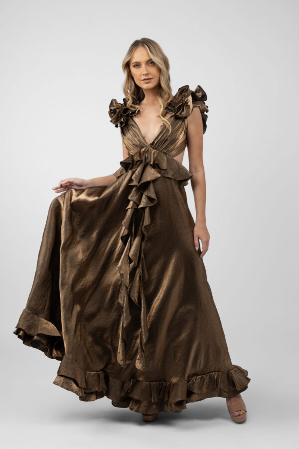 Rochie lunga cu decupaje si volane Dark Gold