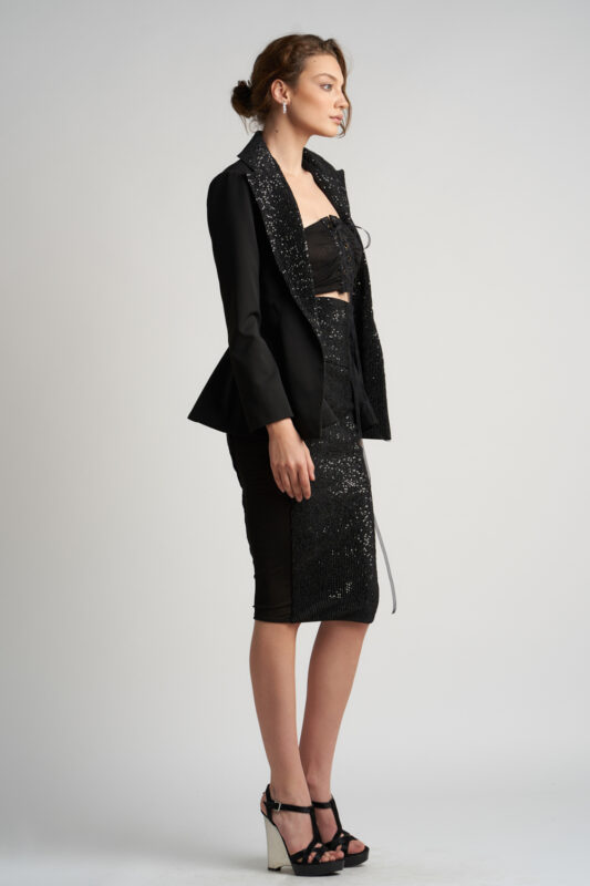Măsurile modelului (cm): 84-59-89. Înălţimea modelului este 176 cm şi produsul fotografiat este mărimea XS (34).