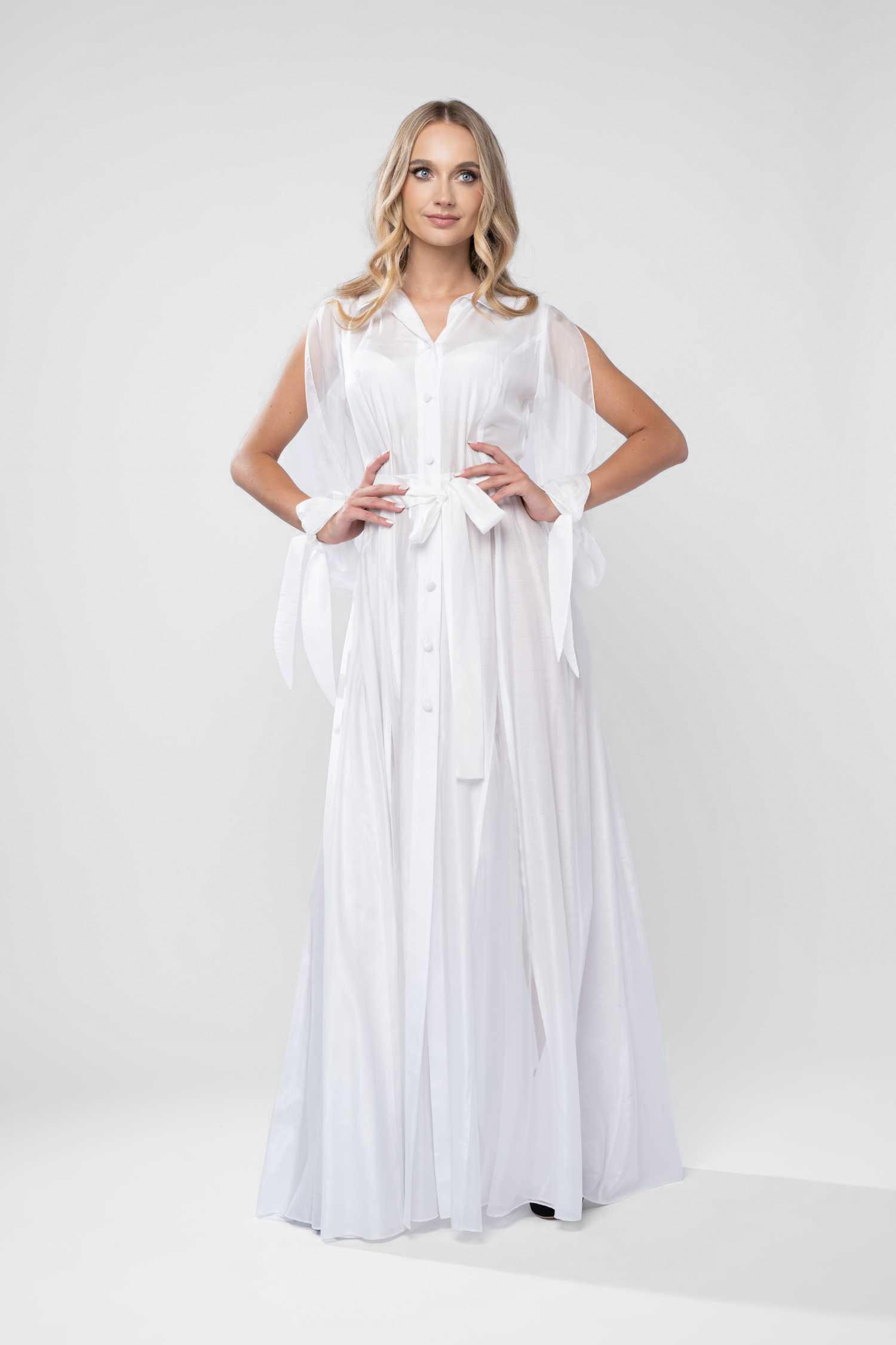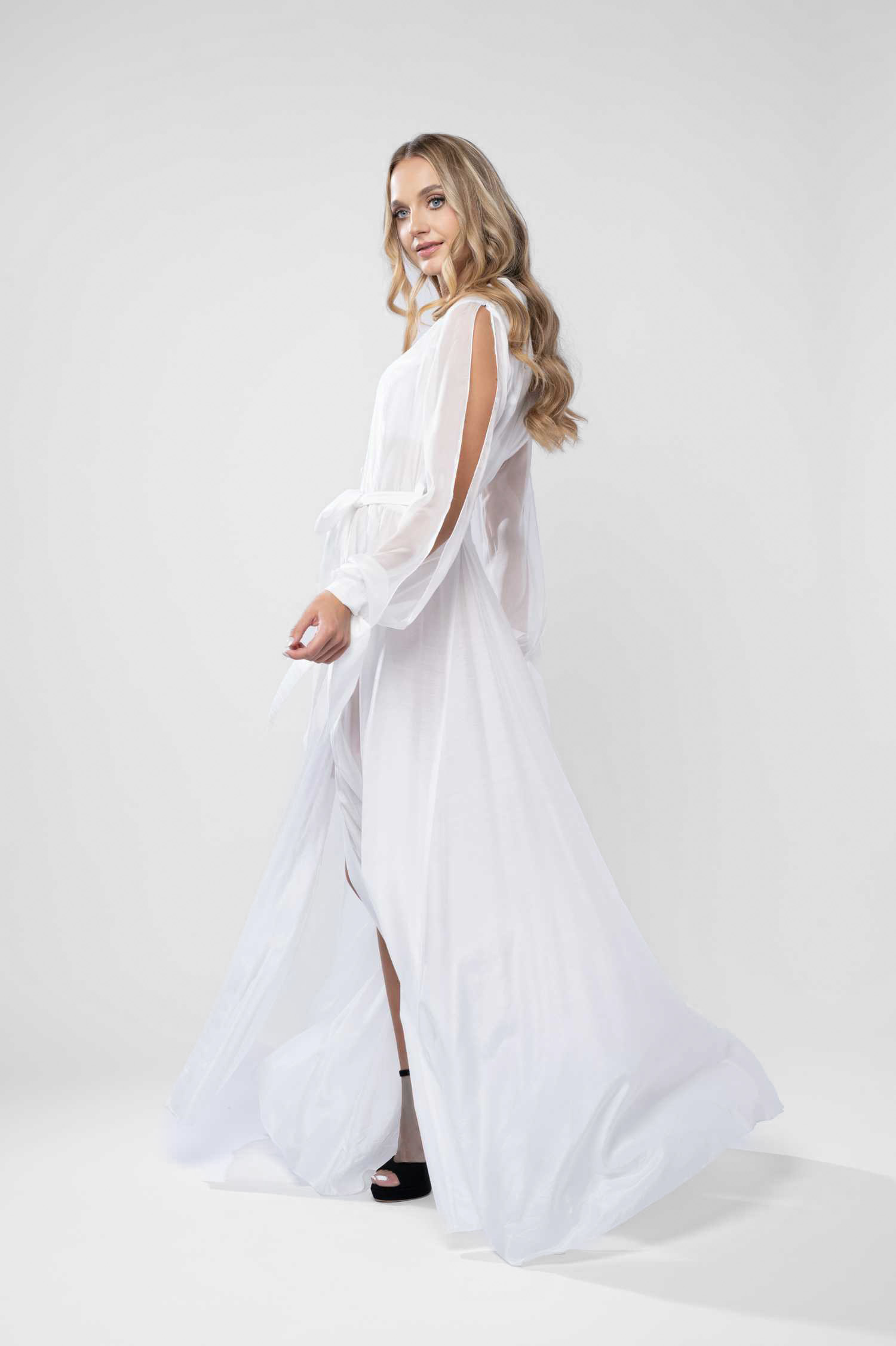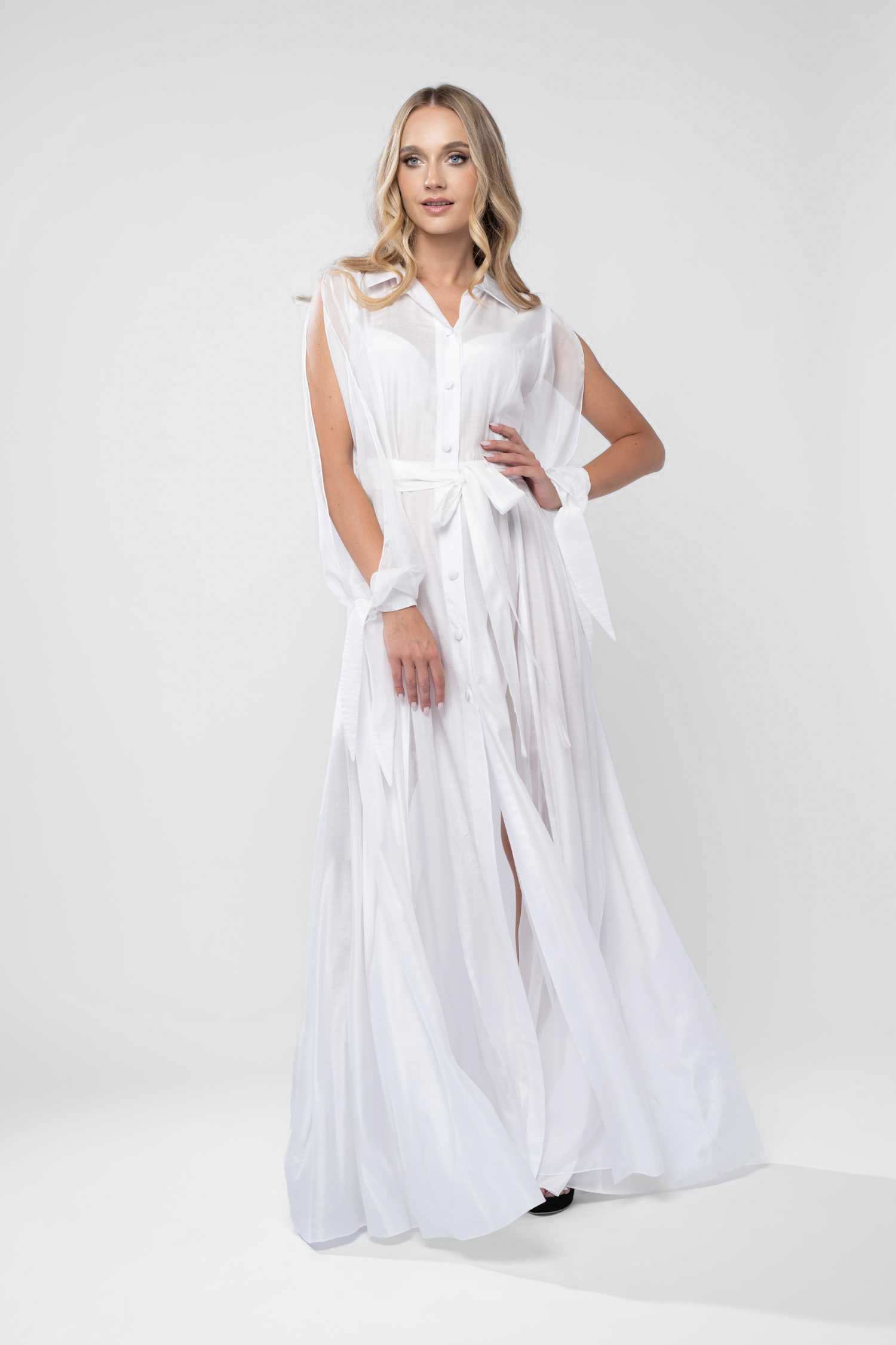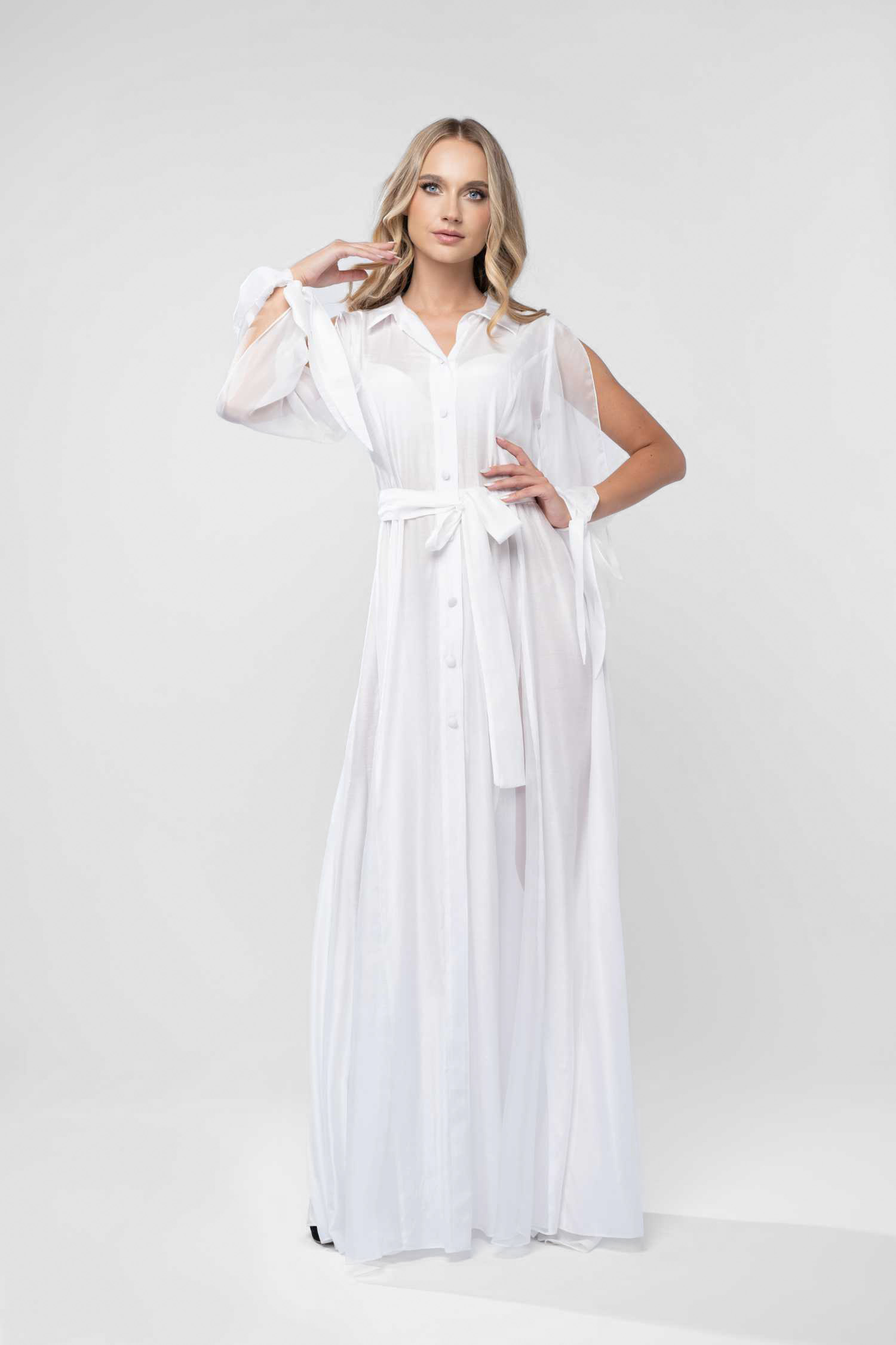 Rochie lunga tip camasa cu insertii din voal, avand un design fluid, cu croiala ampla si clini transparenti. Manecile sunt accentuate prin decupaje elegante, completate cu funda reglabila la incheietura pentru un efect jucaus. Inchiderea frontala cu nasturi si cordonul detasabil marcheaza talia si adauga versatilitate tinutei. Potrivita pentru evenimente de zi sau ocazii speciale, cand iti doresti un look sofisticat, cu o nota fresh si feminina.