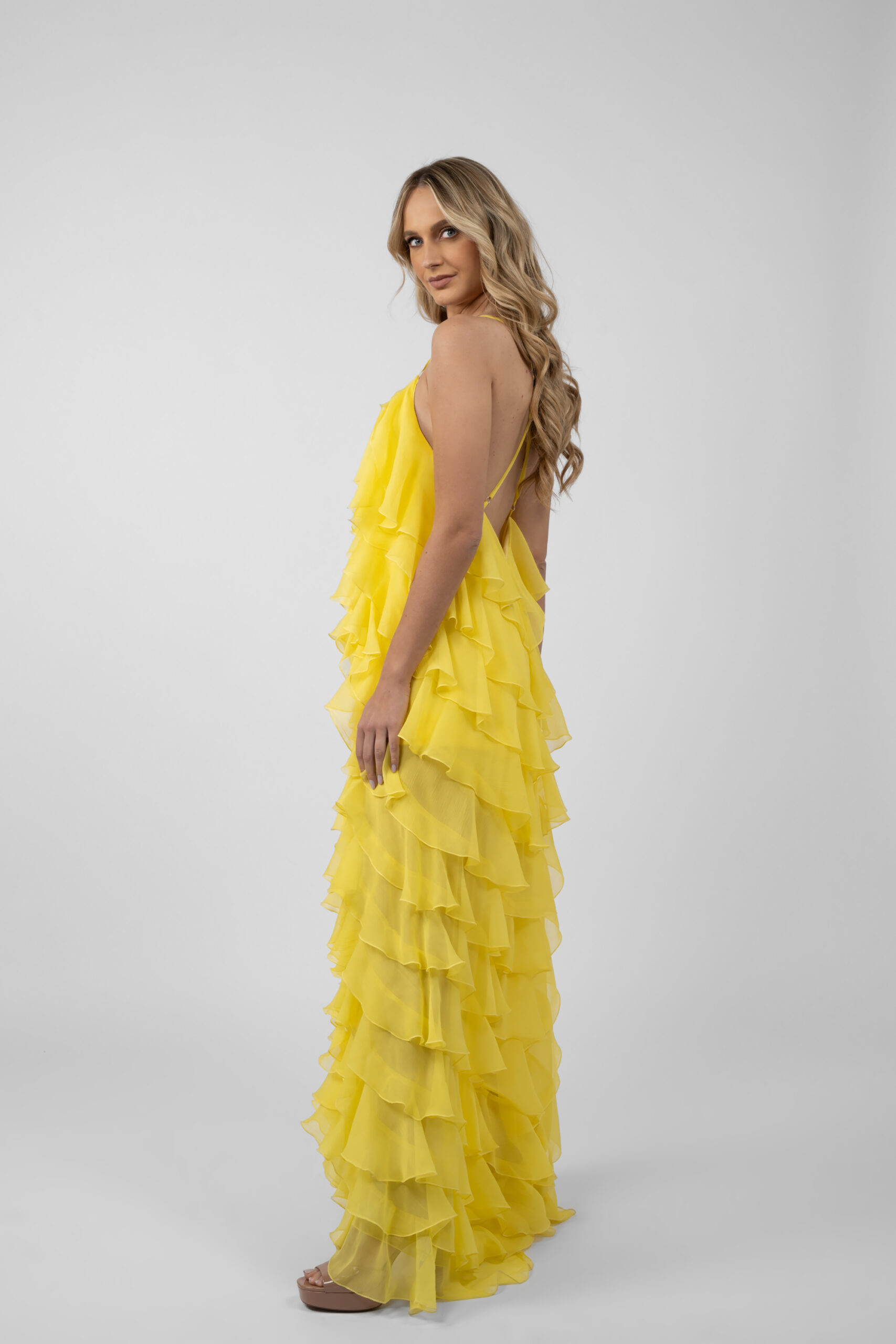 Rochie maxi spectaculoasa, cu volane multiple din amestec de matase, creata pentru a atrage priviri la orice aparitie. Bretelele subtiri sustin discret bustul, iar spatele este lasat gol, cu bretele incrucisate ce accentueaza linia umerilor si delicatetea siluetei. Volanele suprapuse creeaza un joc fluid de volum si miscare, conferind rochiei un aer sofisticat si effortless. Potrivita pentru petreceri de vara, cocktailuri si evenimente glam, este alegerea perfecta atunci cand vrei un look senzual, lejer si memorabil.