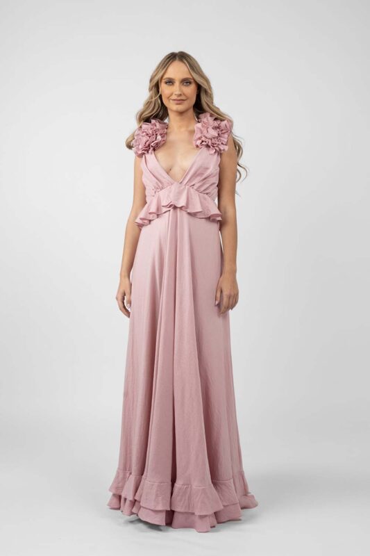 Aceasta rochie lunga cu design fara maneci si spate decupat cucereste prin detalii sofisticate si eleganta sculpturala. Talia este marcata delicat, in timp ce partea inferioara se deschide intr-o fusta ampla cu volum si fluiditate, ce adauga un efect dramatic si feminin. Decupajul din spate, inchis discret cu o fundita, subliniaza senzualitatea rochiei si transforma piesa intr-o alegere ideala pentru evenimente speciale.