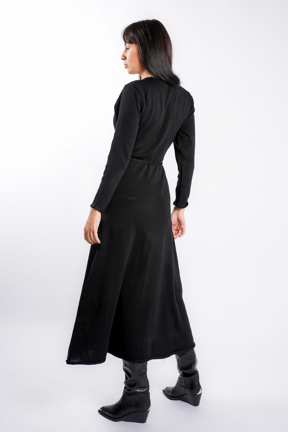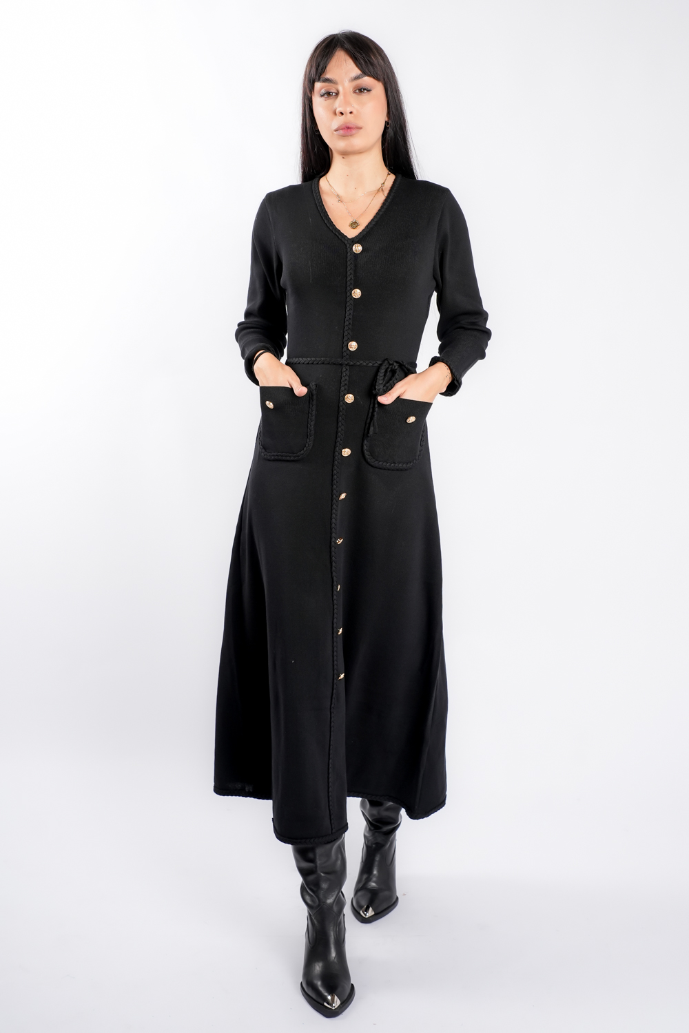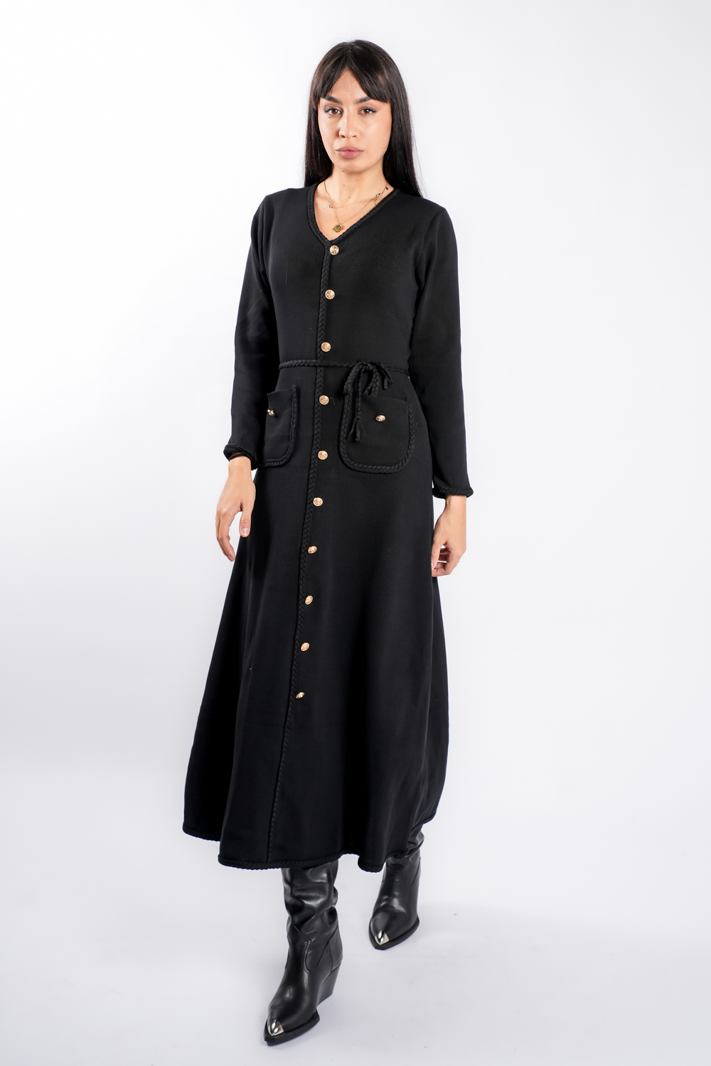 Rochie eleganta cu croiala lunga si detalii rafinate impletite, definita prin nasturii aurii si cordonul impletit care accentueaza talia. Buzunarele frontale si marginile finisate manual adauga un aer sofisticat si confortabil in acelasi timp. O piesa atemporala, potrivita atat pentru tinute de zi, cat si pentru ocazii casual chic.