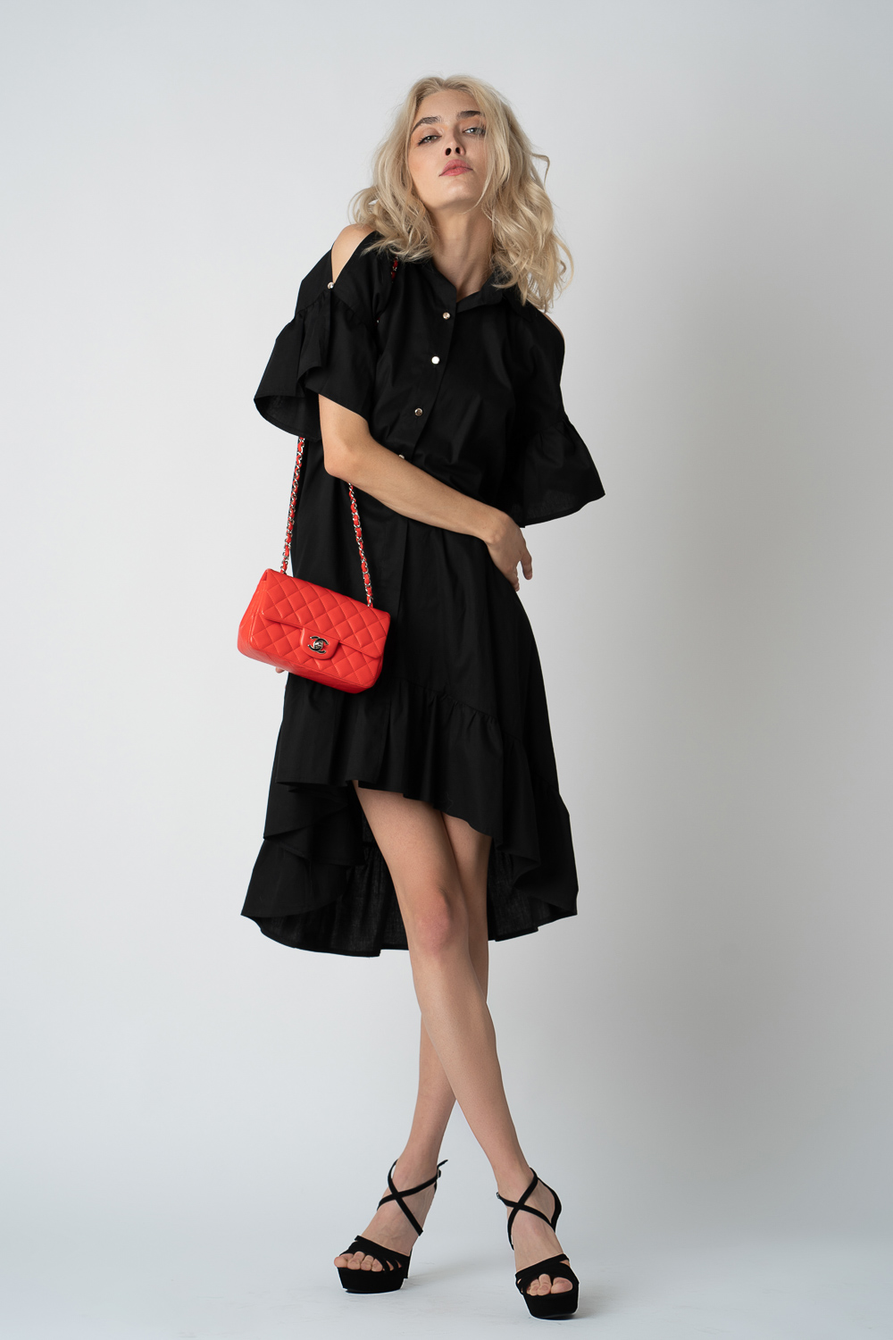 O reinterpretare fresh a clasicei rochii camasa, aceasta piesa neagra atrage prin croiala lejera si detaliile decupate de pe umeri. volanul amplu si lungimea asimetrica creeaza miscare si fluiditate, conturand un look relaxat dar sofisticat. Versatila si usor de accesorizat, poate fi purtata atat cu sandale joase, cat si cu tocuri pentru un efect glam urban.