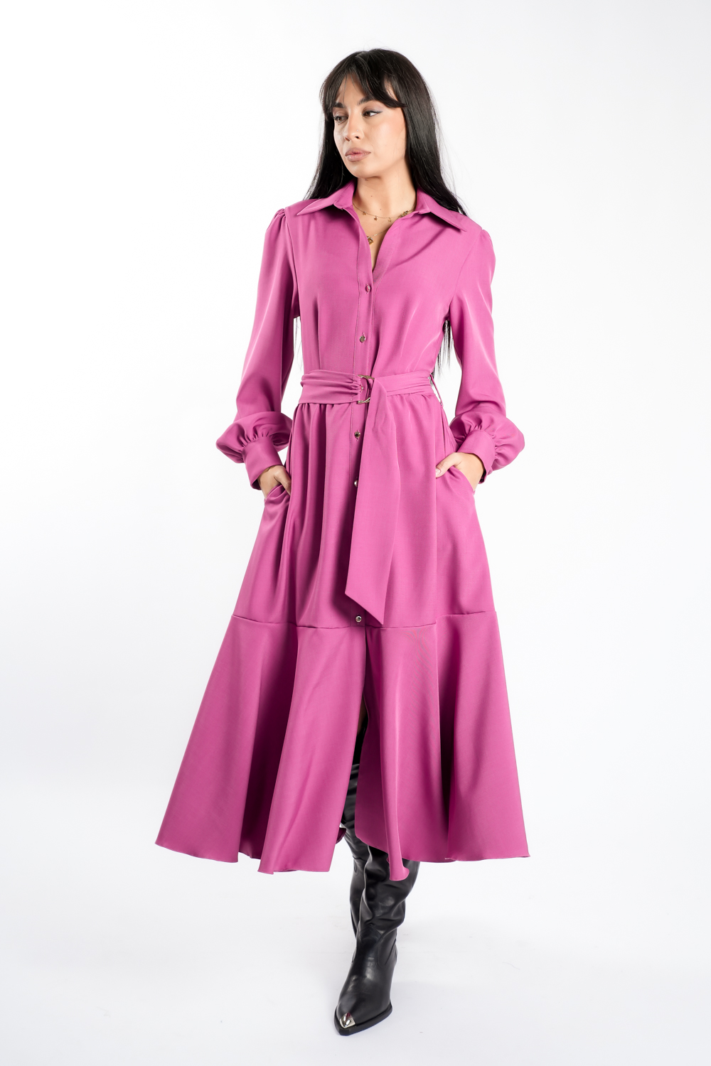 Rochie camasa cu linii clasice si o silueta feminina, realizata din stofa fina din amestec de vascoza ce ofera confort si tinuta impecabila. Designul este accentuat de nasturii frontali si de cordonul detasabil, care marcheaza talia si adauga echilibru proportiilor. Manecile lungi cu mansete si fusta ampla creeaza o alura eleganta, ideala pentru tinute de zi sau aparitii office cu personalitate.