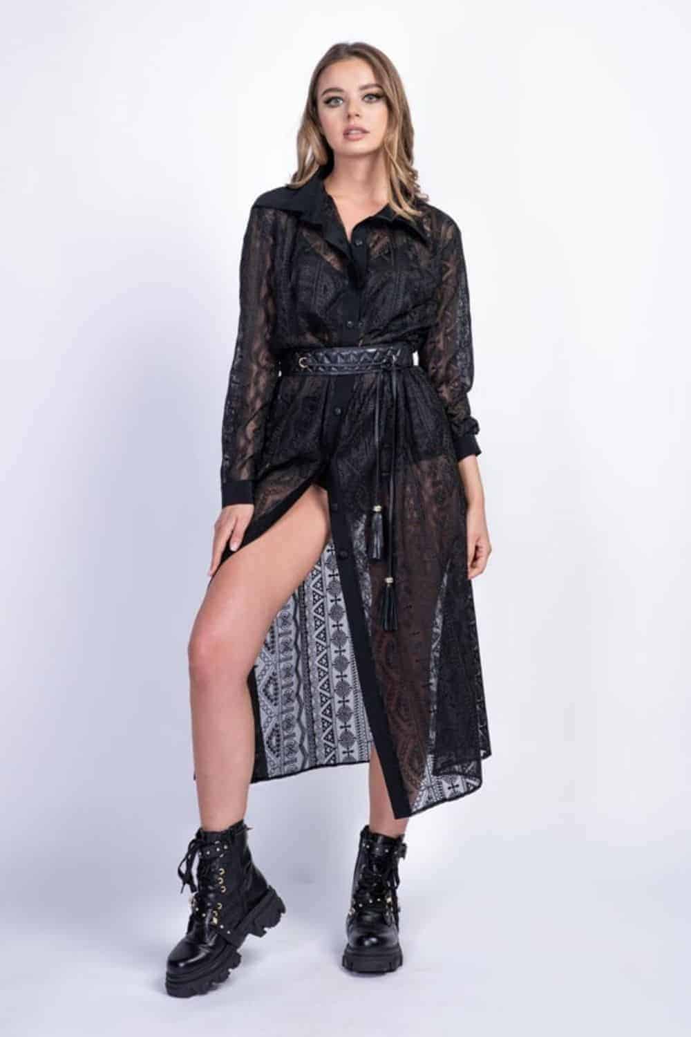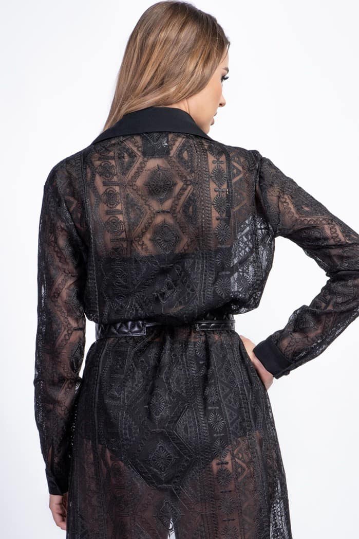 Rochie cămașă din mătase brodată. Rochia cămașă este alegerea perfectă pentru zilele lejere de vară, dar și pentru orele petrecute la birou. Această piesă îndrăzneață din mătase brodată poate fi purtată ca atare sau cu un furou negru, dacă vrei un plus de modestie. Accesorizează cu o centură lată și bocanci pentru un look grunge, sau cu pantofi stiletto și bijuterii fine dacă participi la un eveniment formal.