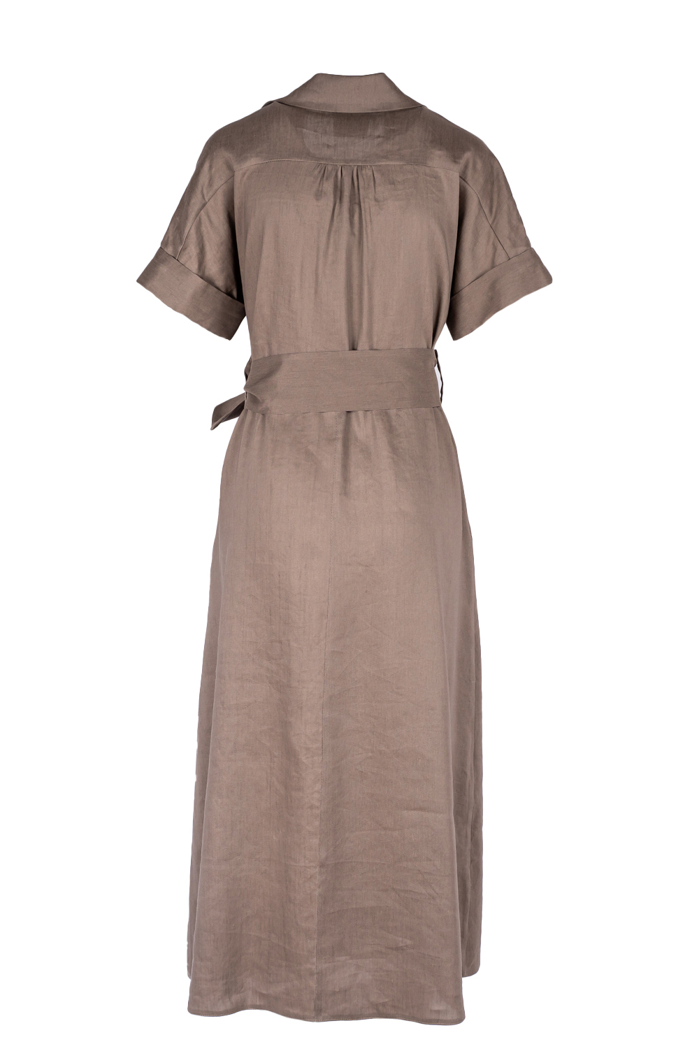 Rochia perfecta pentru zilele in care eleganta se traduce prin simplitate. Realizata din in, aceasta rochie camasa este pusa in valoare de nasturii discreti si de cordonul in talie, care permite ajustarea siluetei. Croiul lejer, buzunarele laterale si slitul frontal ii confera un aer fluid si natural, ideal pentru tinute de zi cu un strop de rafinament.