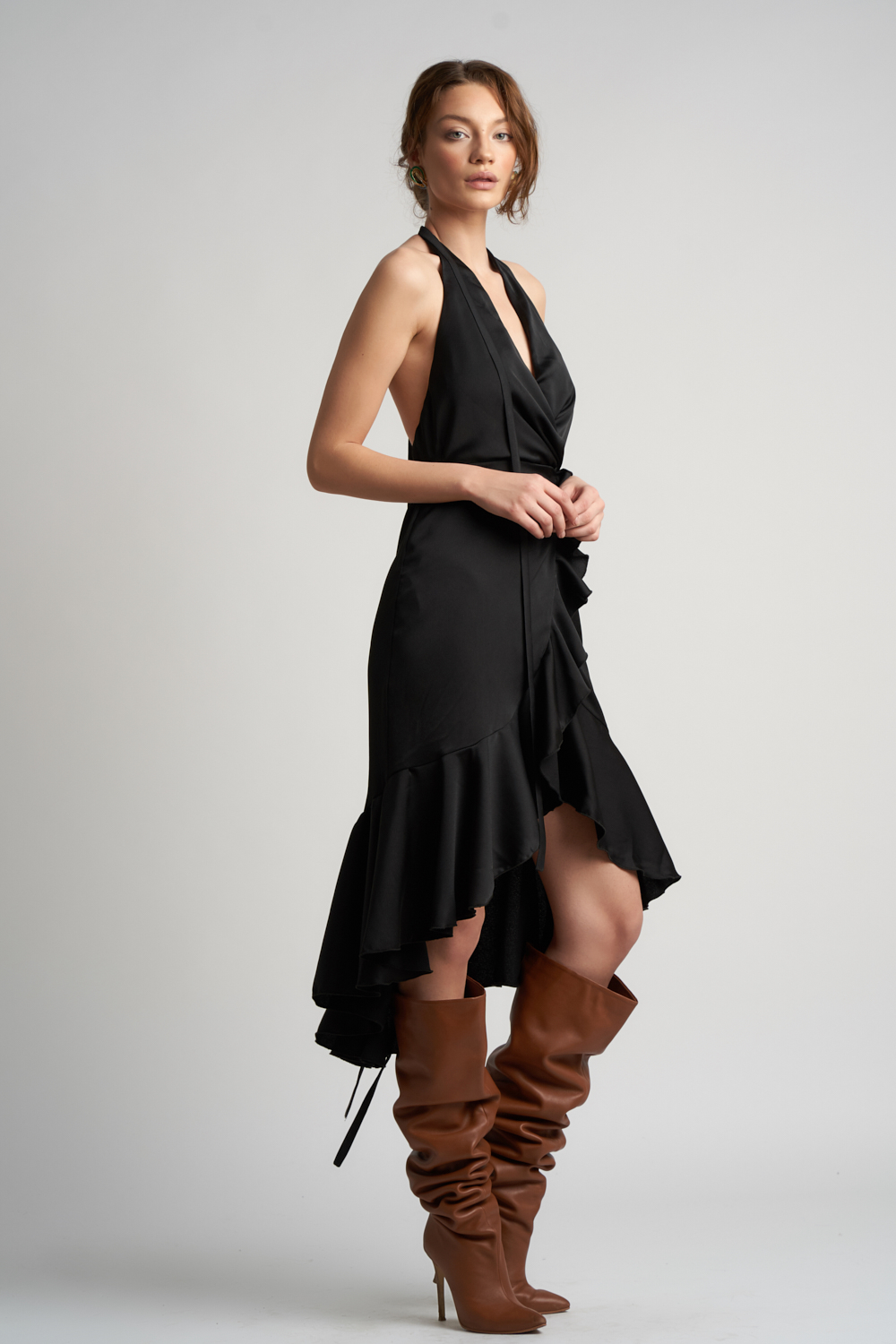 O piesa sofisticata si feminina, rochia neagra petrecuta din satin impresioneaza printr-o constructie fluida si detalii atent definite. Decolteul halter evidentiaza linia umerilor, iar spatele complet gol adauga un accent seducator si elegant.