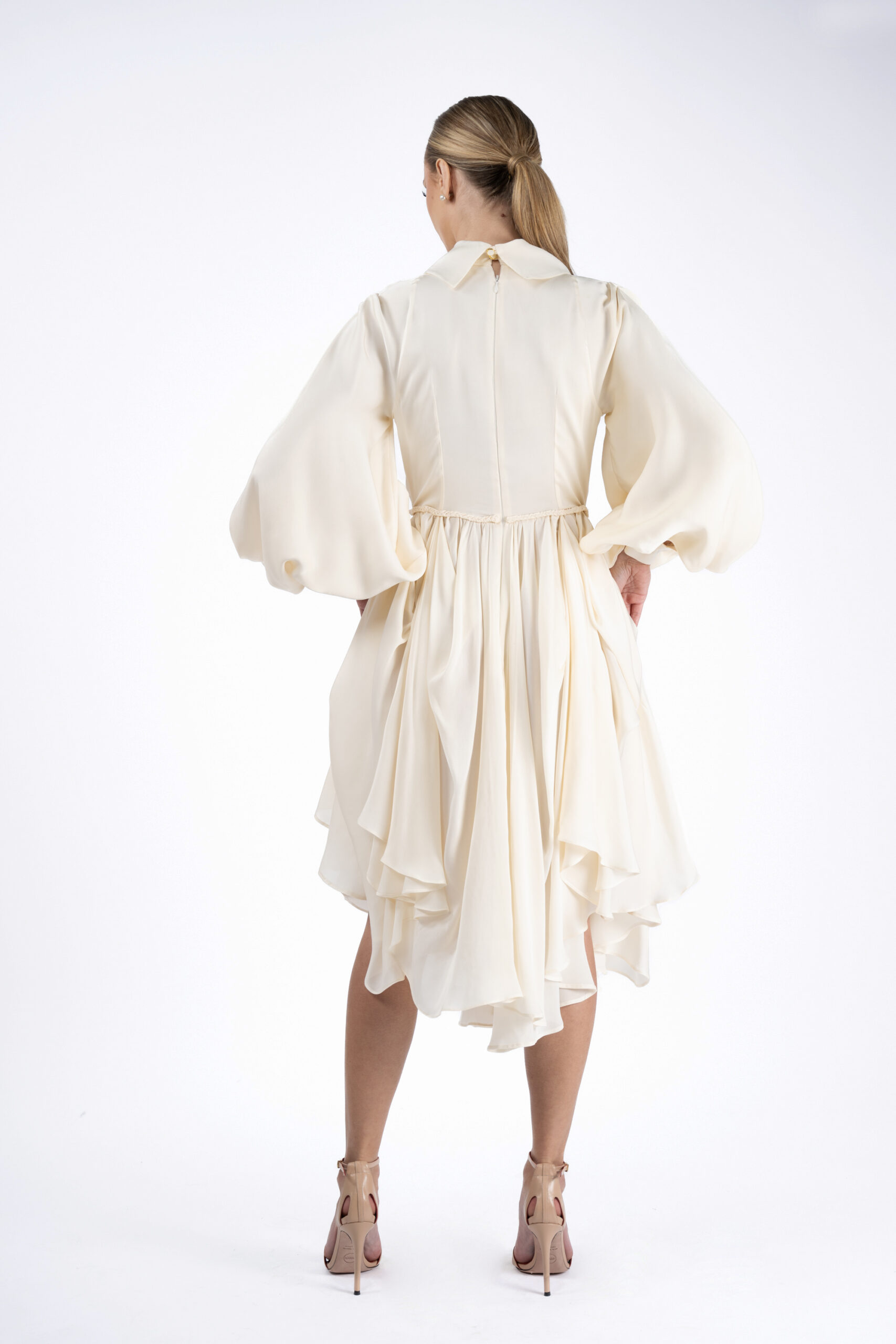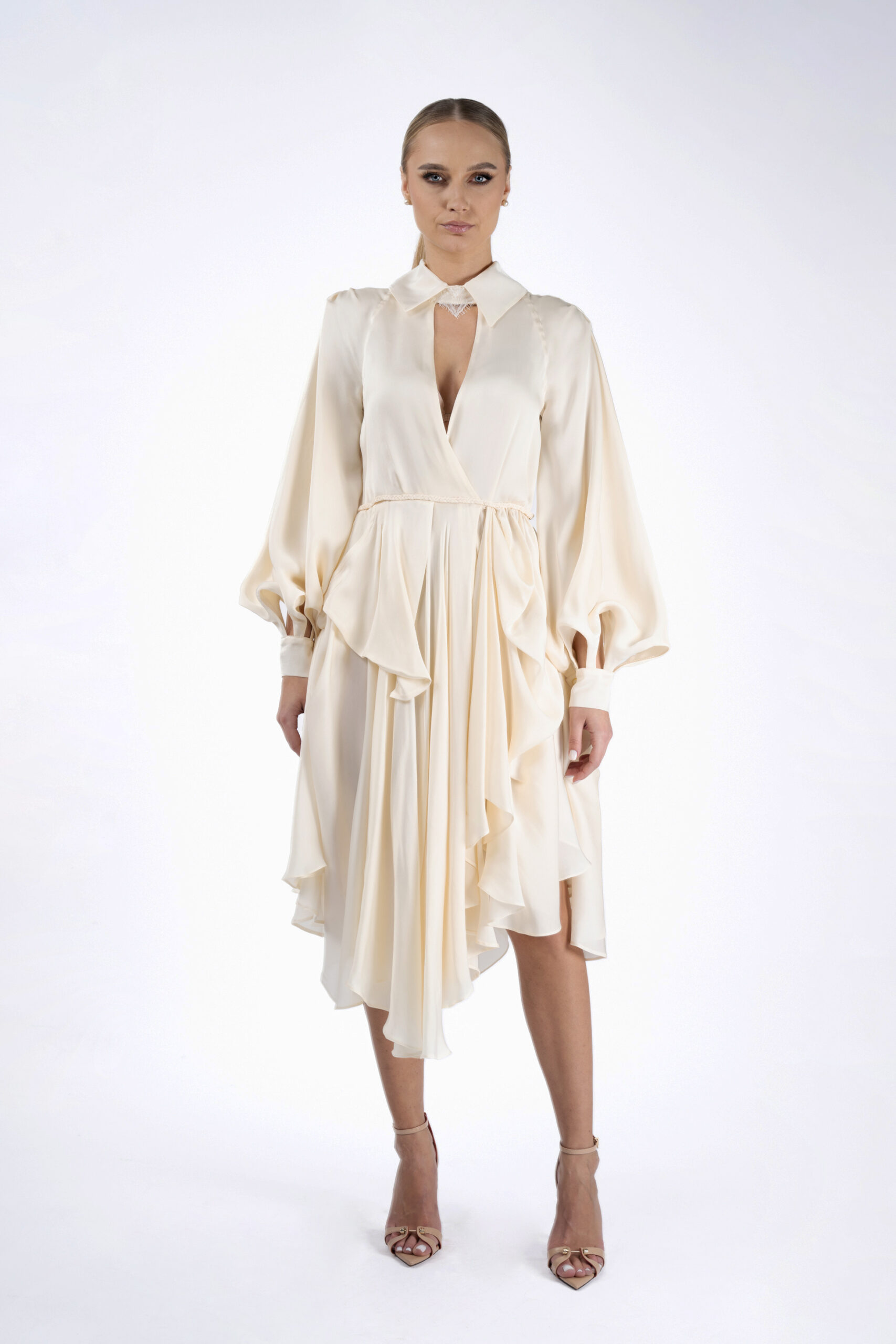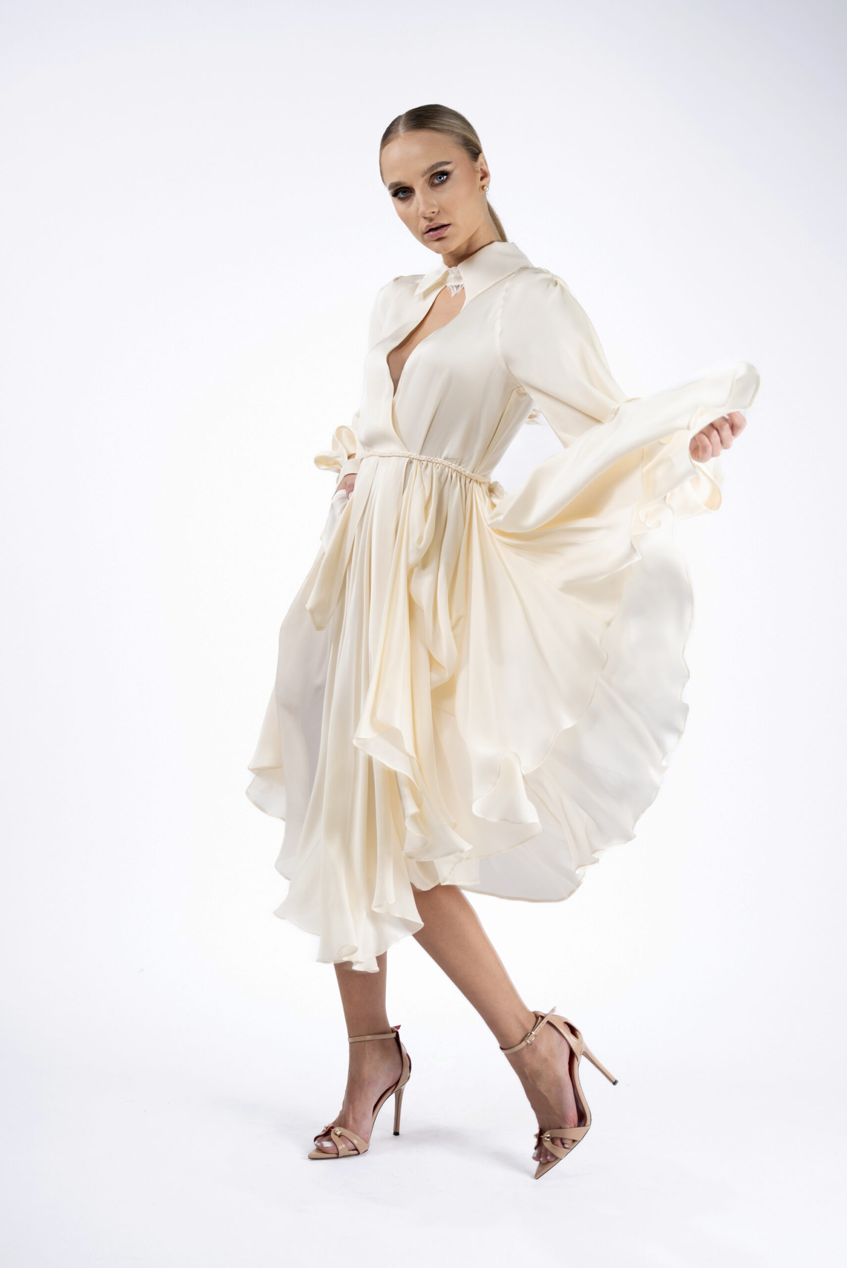 Rochie din matase naturala, definita de croiul stil petrecut si asimetric al fustei. Manecile ample, cu terminatie stransa, si detaliul tip guler adauga un contrast intre structura si lejeritate, conturand o piesa sofisticata si feminina.