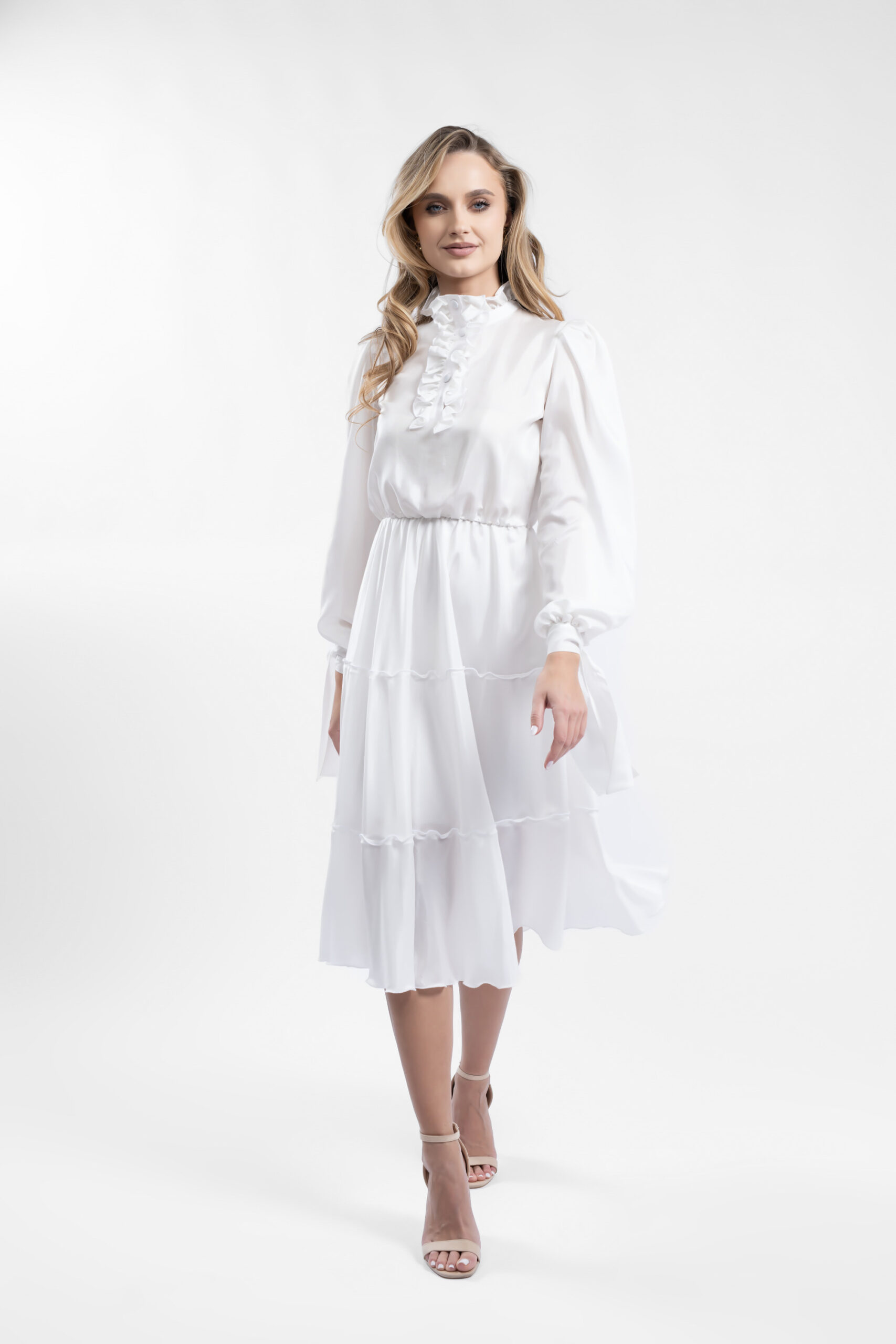 Rochie midi alba cu volane si guler inalt