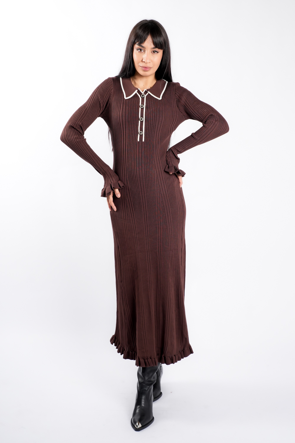 Rochie midi din tricot fin, cu croiala feminina ce urmareste linia corpului si terminație ampla cu volane discrete. Gulerul contrastant si nasturii decorativi adauga o nota eleganta, inspirata din stilul retro. Manecile lungi evazate completeaza designul rafinat, creand o piesa ideala pentru zilele de toamna si momentele casual-chic.