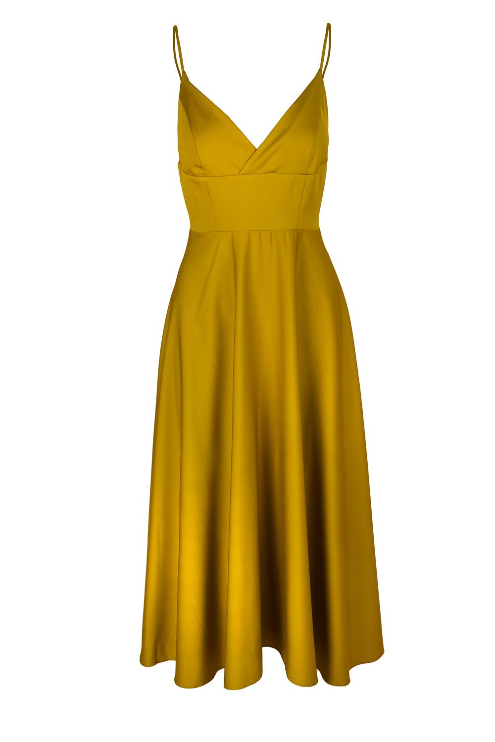 Decolteul în V al rochiei adaugă un element de senzualitate și eleganță, subliniind linia gâtului și a claviculei într-un mod delicat și sofisticat. Bretelele subțiri oferă un aspect modern și rafinat, completând designul minimalist și elegant al rochiei.
