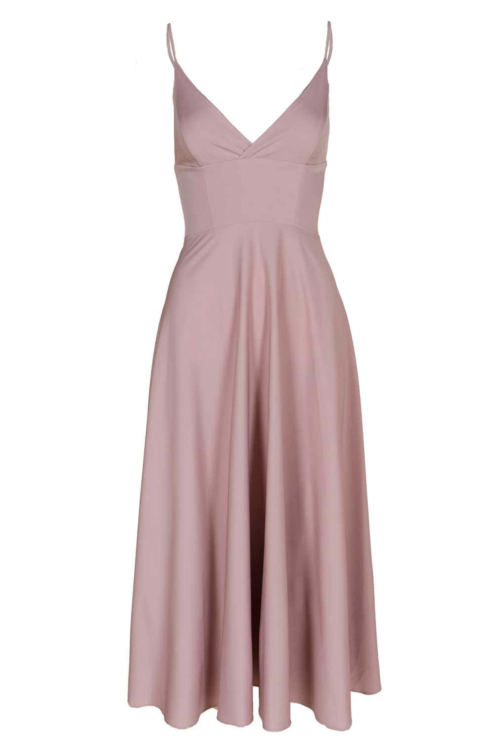 Decolteul în V al rochiei adaugă un element de senzualitate și eleganță, subliniind linia gâtului și a claviculei într-un mod delicat și sofisticat. Bretelele subțiri oferă un aspect modern și rafinat, completând designul minimalist și elegant al rochiei.
