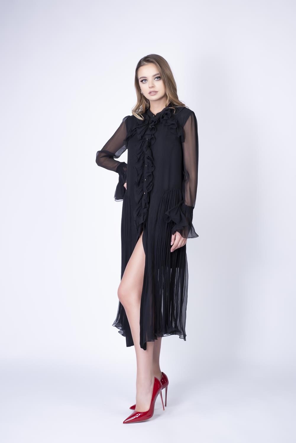 Rochie midi realizata din voal fin de matase, definita de volane delicate pe partea frontala si fronseuri laterale care evidentiaza subtil linia taliei. Manecile lungi cu mansete ample si inchiderea frontala cu nasturi completeaza un design feminin si rafinat, in timp ce fusta plisata adauga fluiditate si miscare siluetei. O piesa eleganta si versatila, potrivita atat pentru tinute de zi sofisticate, cat si pentru aparitii speciale.