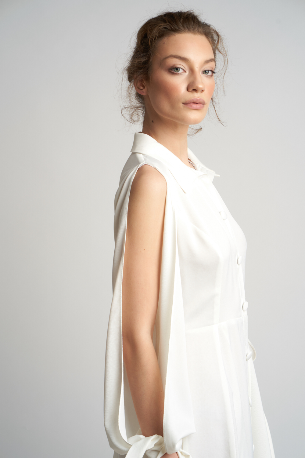 Elementul distinctiv este reprezentat de manecile despicate, fluide, accesorizate cu esarfe la incheietura, care adauga miscare si feminitate intregii siluete. Croiala pune in valoare talia si cade natural pe corp, oferind confort si eleganta in acelasi timp.