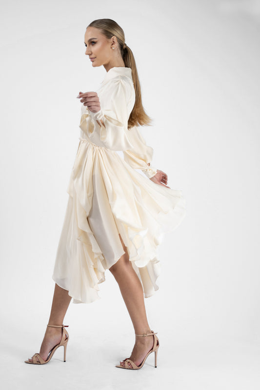 Rochie din matase naturala, definita de croiul stil petrecut si asimetric al fustei. Manecile ample, cu terminatie stransa, si detaliul tip guler adauga un contrast intre structura si lejeritate, conturand o piesa sofisticata si feminina.