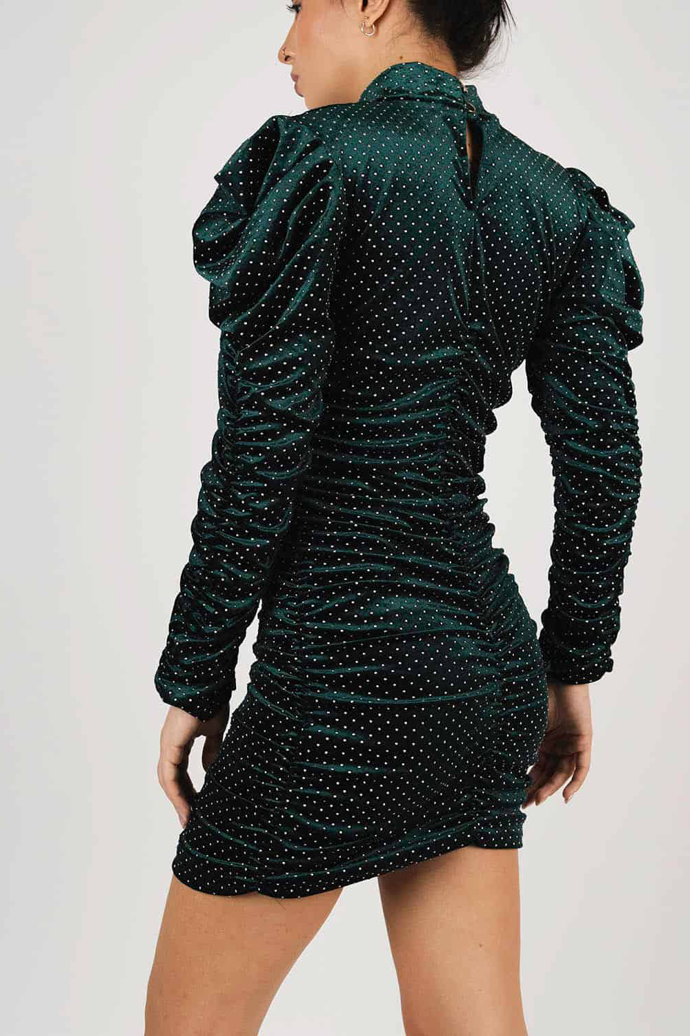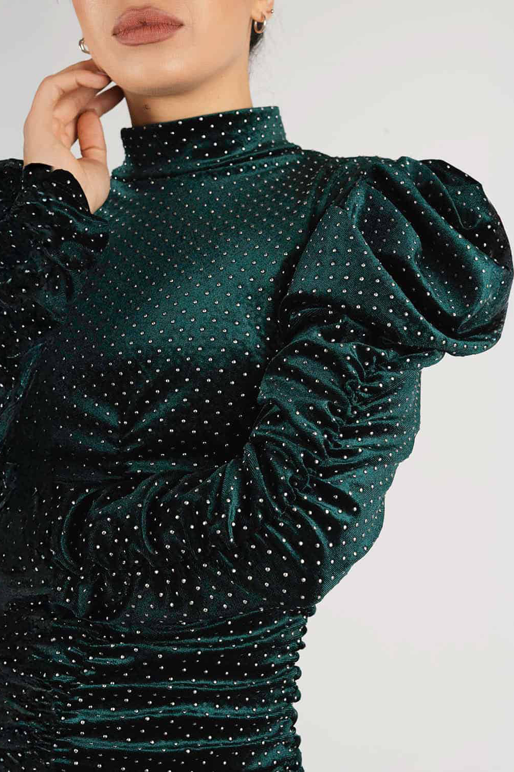 Această rochie mini realizată din catifea verde cu detalii strălucitoare este alegerea perfectă pentru evenimentele speciale sau serile de neuitat. Cu o croială feminină și sofisticată, rochia accentuează silueta prin drapajele sale, iar mânecile bufante adaugă un plus de dramatism și eleganță. Textura moale a catifelei combinată cu strălucirea subtilă a detaliilor transformă această piesă într-o declarație de stil.