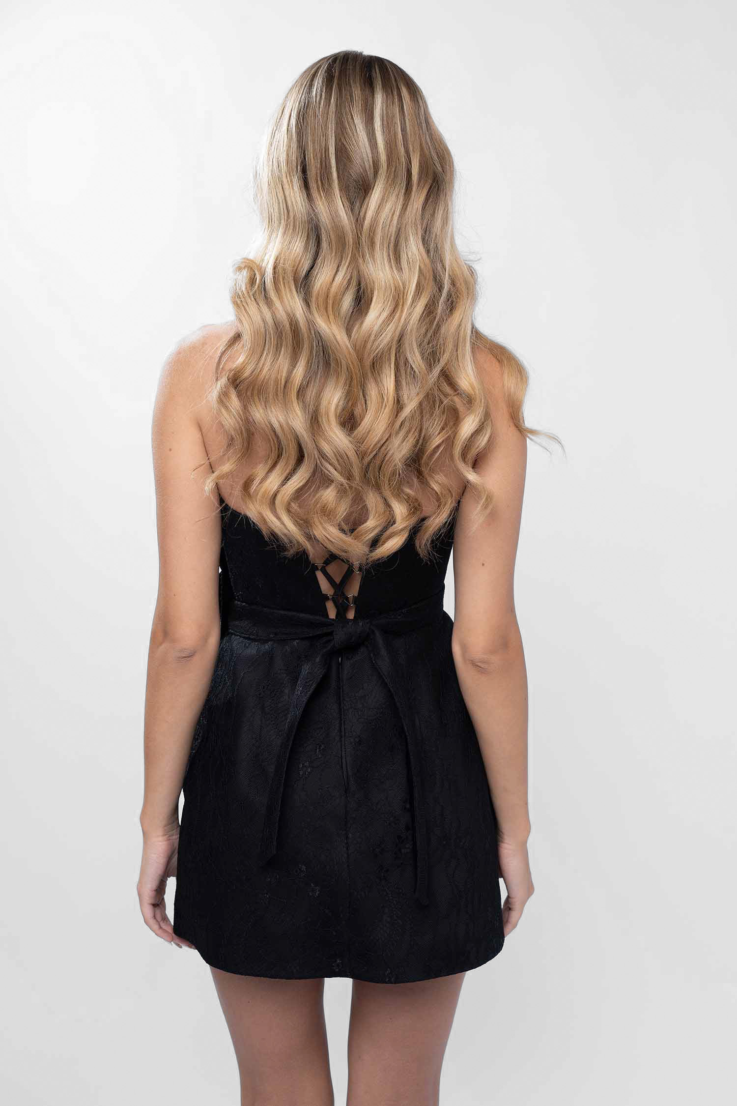 O piesa cu aer romantic si rafinat, aceasta rochie scurta din dantela chantilly impresioneaza prin detaliul floral maxi aplicat in talie. Conceputa pentru a evidentia delicatetea siluetei, este alegerea ideala atunci cand vrei sa iesi in evidenta prin eleganta si feminitate. Spatele descoperit cu sistem de prindere corset adauga un plus de senzualitate.