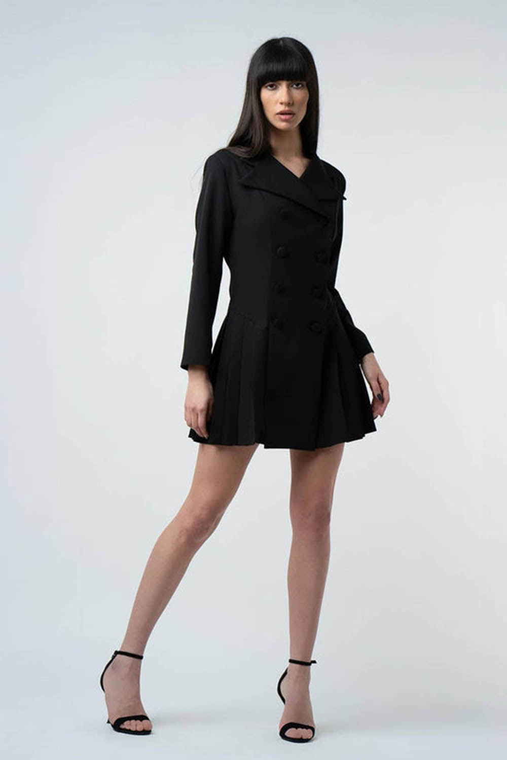 O piesa care imbina rigoarea sacoului cu fluiditatea unei rochii in clos, rochia sacou cu pliuri atrage prin croiala structurata si jocul subtil dintre masculin si feminin. Perfecta pentru aparitii elegante dar moderne, aceasta piesa se remarca prin designul sofisticat si detaliile minimaliste.