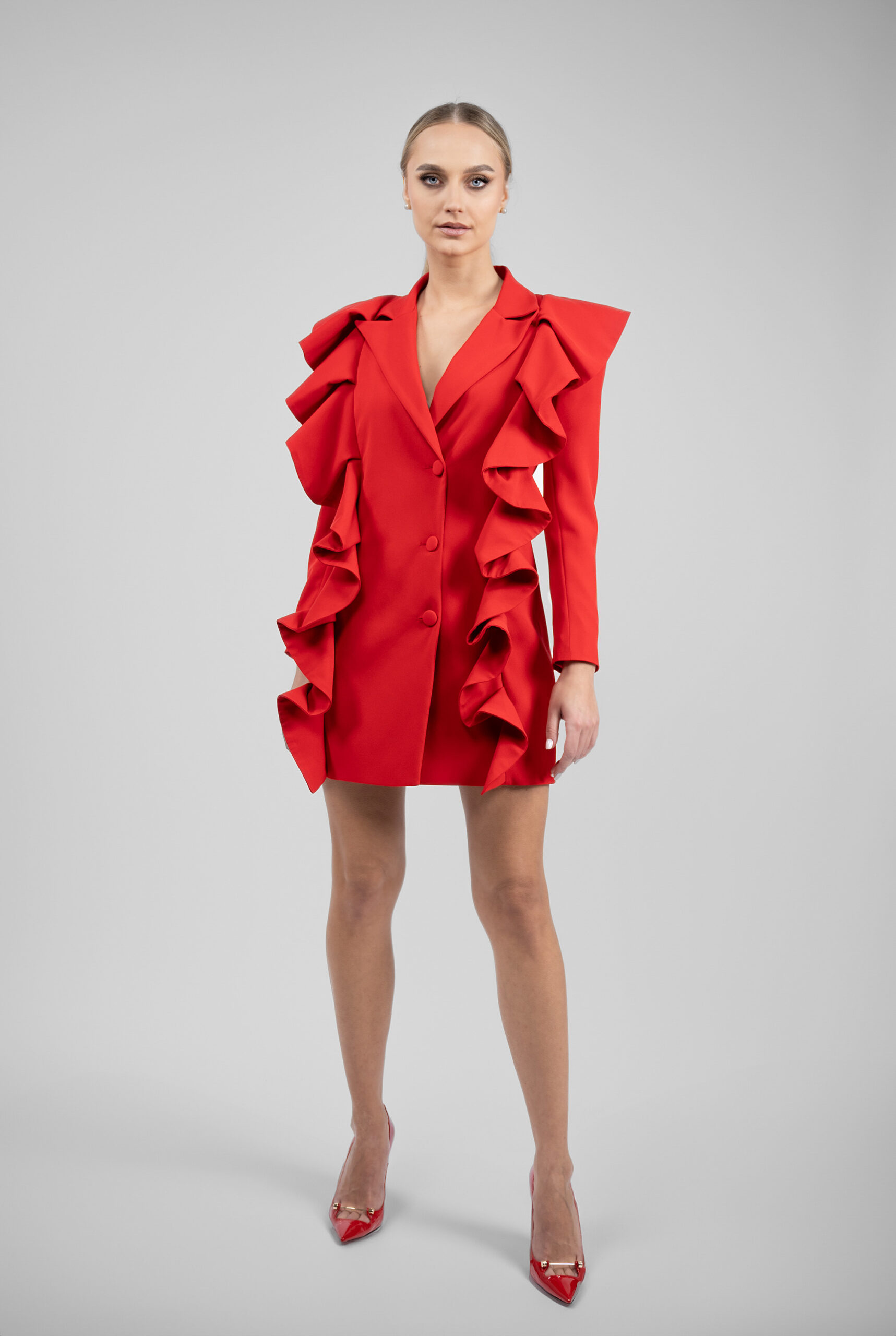 Introduceți o notă de eleganță și feminitate în garderoba dvs. cu această rochie sacou sofisticată. Cu volane delicate și detalii cu nasturi, această rochie adaugă un aer chic și rafinat fiecărei ținute. Umerii supradimensionali conferă o siluetă impunătoare și un aspect modern, în timp ce detaliile de pe spate completează look-ul cu un element de surpriză și rafinament.