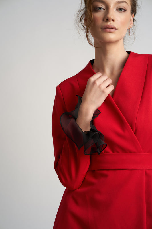Un mix rafinat intre tailoring si feminitate, aceasta rochie reinterpretata in stil sacou adauga un aer sofisticat si fresh oricarei aparitii. Realizata din stofa premium neagra, cu volane delicate din matase alba la tiv si la maneci, rochia creeaza un contrast spectaculos. Cordonul lung evidentiaza talia, iar croiala in stil kimono ofera o silueta eleganta, potrivita atat pentru evenimente de zi cat si de seara.
