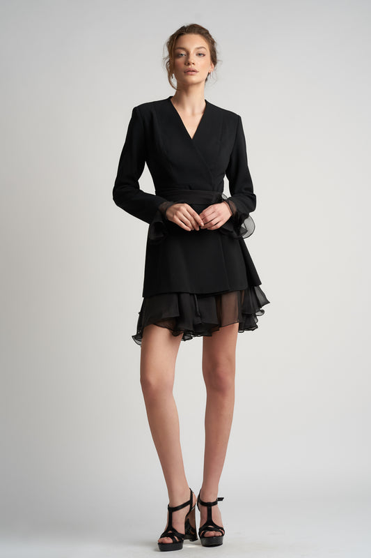 Un mix rafinat intre tailoring si feminitate, aceasta rochie reinterpretata in stil sacou adauga un aer sofisticat si fresh oricarei aparitii. Realizata din stofa premium neagra, cu volane delicate din matase alba la tiv si la maneci, rochia creeaza un contrast spectaculos. Cordonul lung evidentiaza talia, iar croiala in stil kimono ofera o silueta eleganta, potrivita atat pentru evenimente de zi cat si de seara.